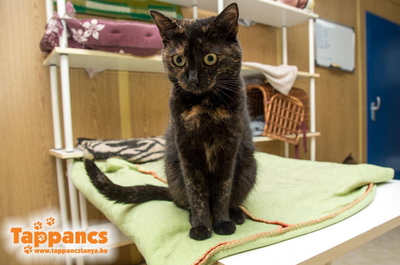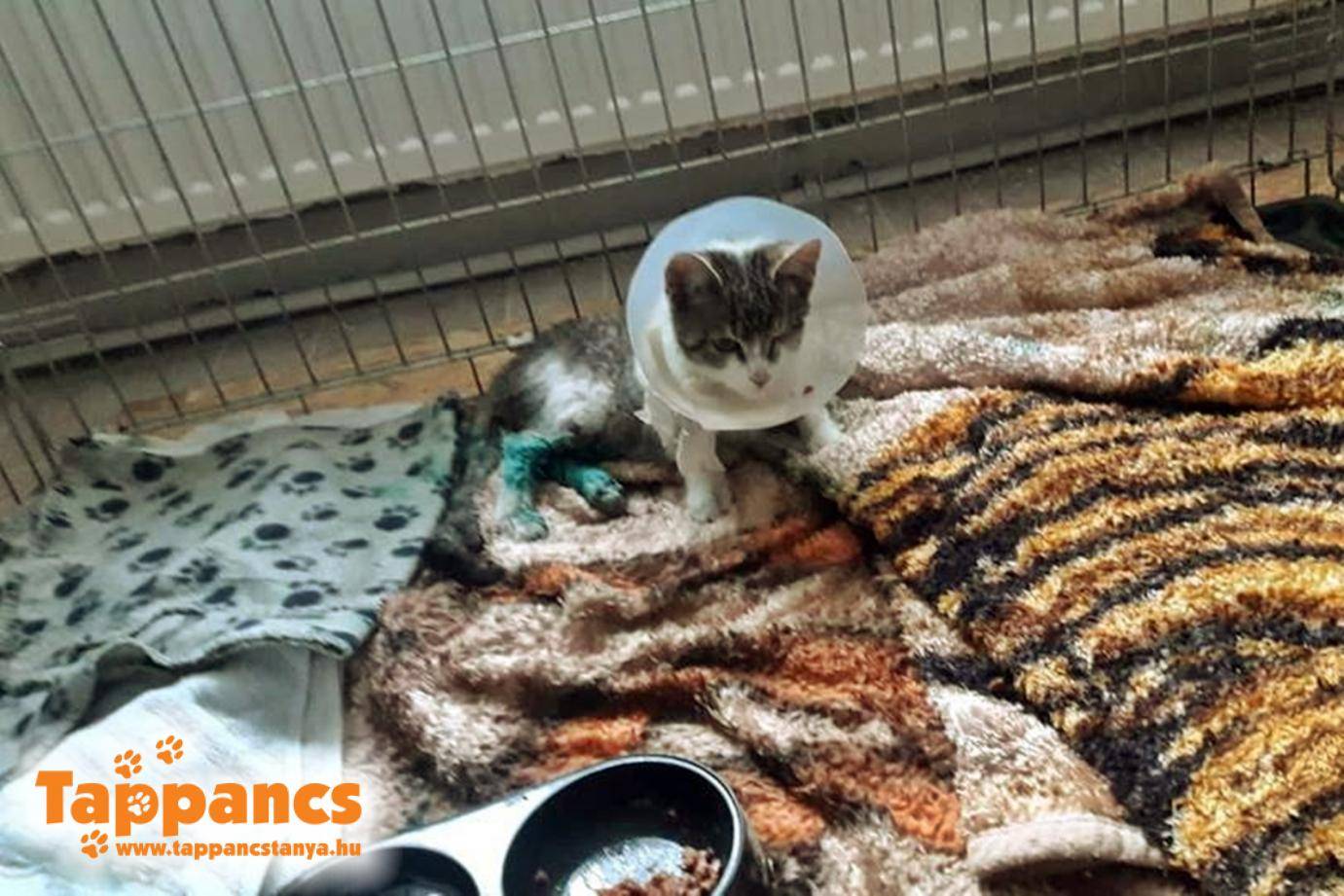 Pénteken segítségkérést kaptunk telefonon, balesetes cica elhelyezésében. Újszegeden, a Fő fasoron egy bokor alatt nyávogva hívta fel magára a figyelmet. A fiatal nő nem hagyta magára, annak ellenére, hogy csak családlátogatásra tért haza, már indultak is vele a menhelyre. Mi azonnal fogadtuk, készítettük elő neki a helyet. Ilyenkor mindig van bennünk egy kis félsz, mert nem tudjuk, mire számítsunk. Azt hiszem, ez az eset felülírta mindazt, amire gondolni is mertünk volna. A hordozóban már láttam, hogy egy kölyök cicáról van szó, akinek véres a hátsó lába. Hogy minél kevesebben mozgassuk, a hordozó tetejét levéve helyeztük át egyikből a másikba. Akkor jött a hideg zuhany, a cica bal hátsó lábán a bőre a lábfejéhez volt gyűrődve. Már telefonáltam is az állatorvosnak, hogy azonnal fogadnia kell minket, hisz friss sérüléssel, kivillanó inakkal beérkezett egy körülbelül 4-5 hónapos cica. Kicsit meg volt szeppenve, de mai napig nem tudom felfogni, hogy egy ilyen apróság hogy tudott ekkora fájdalmak mellett is végtelenül kedves lenni. A rendelőben a doktor úr visszavarrta a bőrt a lábán, pár milliméter tartotta a talpacskájánál. Egy kutya kaphatta el és nyúzta meg a lábát, a másik hátsó lábán is harapás nyomot találtak. Két órás beavatkozás, tatarozás után kábultan tért vissza. Hogy a sokkos állapot miatt, vagy a fájdalomtól, de az is lehet hogy az altatás miatt, de fogalma sem volt, mit csinál, de ahogy átkerült a ketrecbe, önkívületi állapotban, eszeveszettül tépte picinyke szájával a takarót. A látványa hosszú időkre beleégett a retinámba, a tehetetlenség érzete leírhatatlan. Kapott egy gallért, bár a legkisebb is elég nagynak bizonyult, ezért némi átalakítást igényelt. Idegőrlő volt a nap végén magára hagyni és feszülten vártuk a reggelt. Szerencsére óriási ovációval, hangos dorombolással fogadott minket ez a csodás kis teremtés, aki a Pamut nevet kapta.