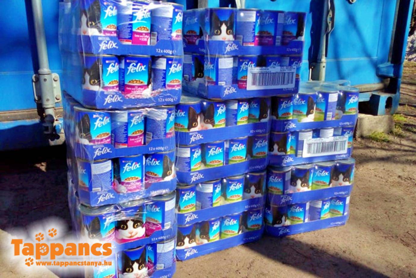 Közben megérkezett a futár, aki több doboznyi csomagot hozott a számunkra. Mikor kibontottuk, hatalmas vigyorral fogadtuk az adományt. Kb. 90 kg cicakonzervet kaptunk ismeretlen feladótól, amit végtelenül nagyon-nagyon szépen köszönünk!