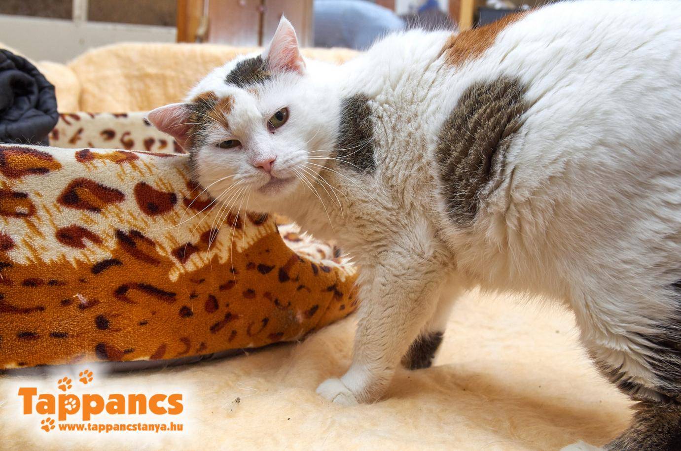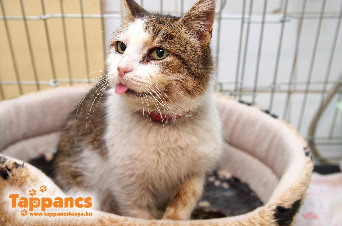 Majd megérkezett a várt cicánk is, Ánya. Őt még tavaly a hideg beállta előtt találta egy állatszerető hölgy az utcájukban, nagyon rossz állapotban. Állatorvoshoz vitte, gyógyíttatta és elszállásolta az udvarukban, míg meg nem találják a gazdiját. Plakátoltak is, valamint a közösségi oldalon is terjengett a fotója, de nem jelentkezett érte senki. Közben elkezdett kikupálódni, egyre jobb étvágya és kedve volt az idősecske nőstény cicának, majd kb. két héttel ezelőtt megint elkezdett romlani az állapota. Ahogy megpillantottam, már az aggódás lett úrrá rajtam, mert nem kizárt valamelyik immunhiányos betegség, a tünetei megvannak. Ezért Ányát, ezt a cukipofit a macskaházban található mosókonyhában szállásoltuk el. Náthás is, ezért a karanténba nem akartuk a többi cica közé behelyezni, immunhiányos cicáink közé sem tehetjük ketrecét, amíg valamilyen támpontunk nincs, hogy merre is tartsunk vele. A szája nagyon rossz állapotban van, beleturkálni nem akartunk, de egyáltalán nem bizalomgerjesztő a látványa szegénynek. Mindenesetre most melegben van, gyorsan bevackolt a kis ágyába és szinte azonnal el is aludt. Olyan mélyen húzta a lóbőrt, hogy ebédidőben ébreszteni kellett és helyes volt, azt sem tudta hol van, csak az orra után ment míg bele nem botlott a tálkába és azonnal nekiesett a falatozásnak. Viszont szájából ömlött a nyála, sőt véres is volt, ami igen kétségbeejtő.