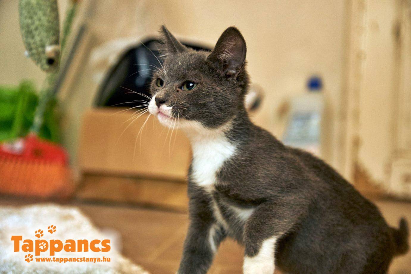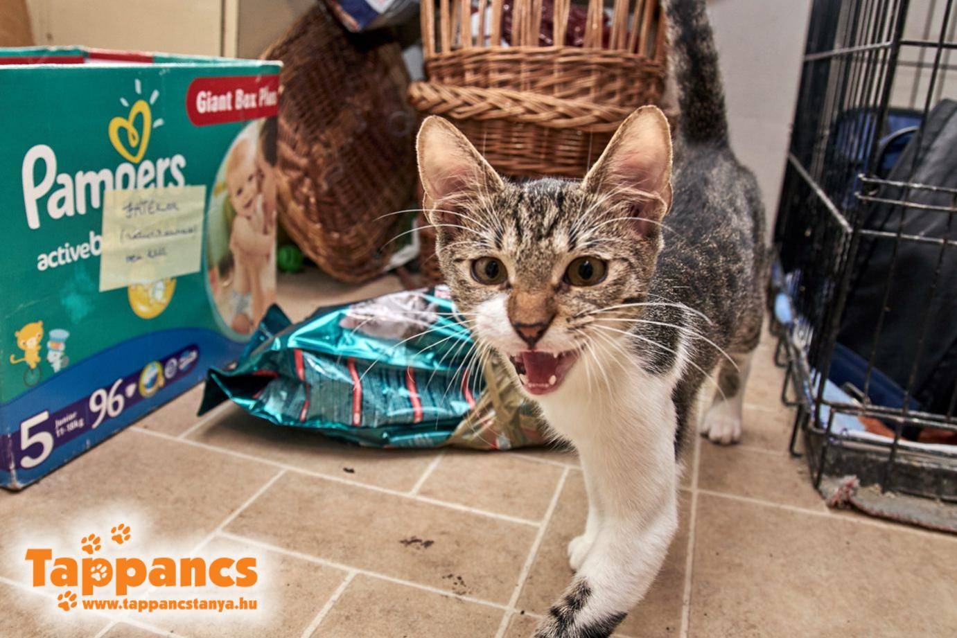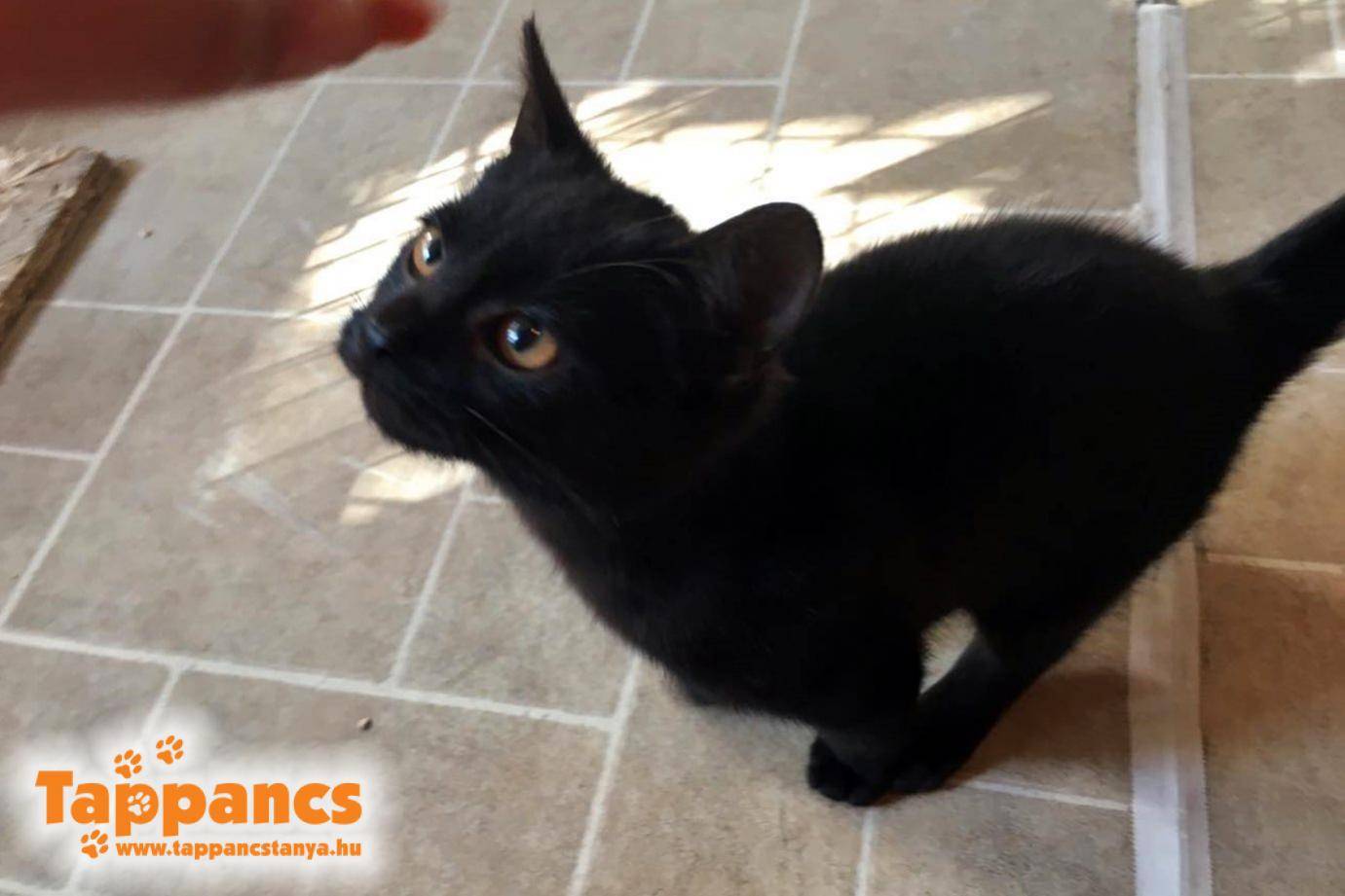 Kedden ismételten egy fekete jövevény "tarkította" az állományt. Ő a Dömper nevet kapta, nem véletlenül. A kölyök kandúrkát egy dorozsmai családi ház udvarába tessékelték be, és az volt a nagy szerencséje, hogy az ott lakók még idejében fel tudták nyalábolni a rá vadászó kutyák elől. Egy fás kamrában tudták elszállásolni az aprócska cicát, akit addig elláttak, míg nem tudtuk fogadni. Dömper ahogy cseperedett, egyre kíváncsibb lett a nagyvilágra, és leselkedett kifelé, de a kutyusok továbbra sem nézték jó szemmel a jelenlétét, így egyre kockázatosabbá vált a maradása. Most egy ketrecben tombolhat, szinte egy perc maradása sincs, ha épp nem a játékait nyüstöli, akkor fennhangon kiabál a kajáért, és mint egy kiéhezett dúvad, úgy vetődik rá az ételre. Emellett cuki és dorombolós gombóc.