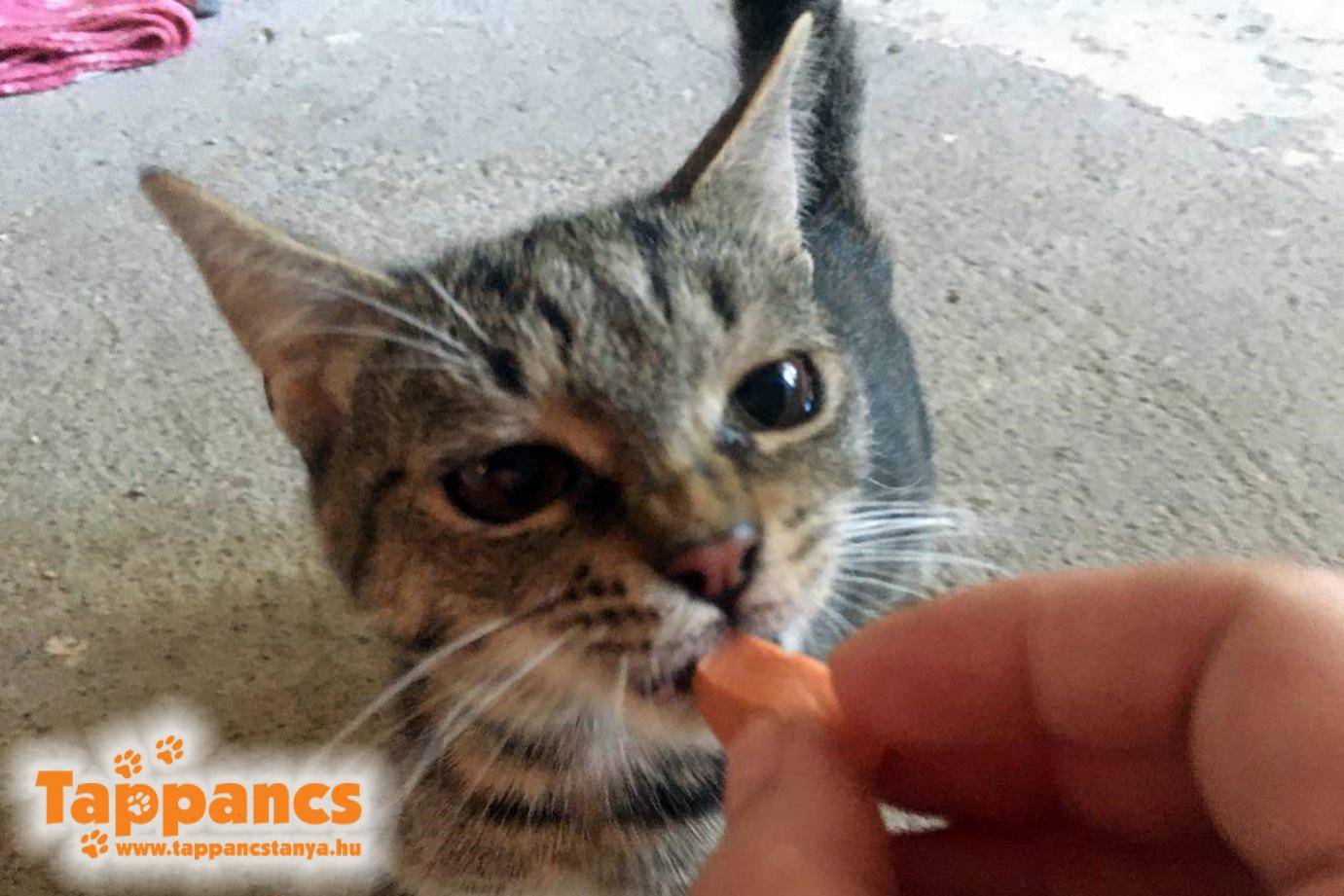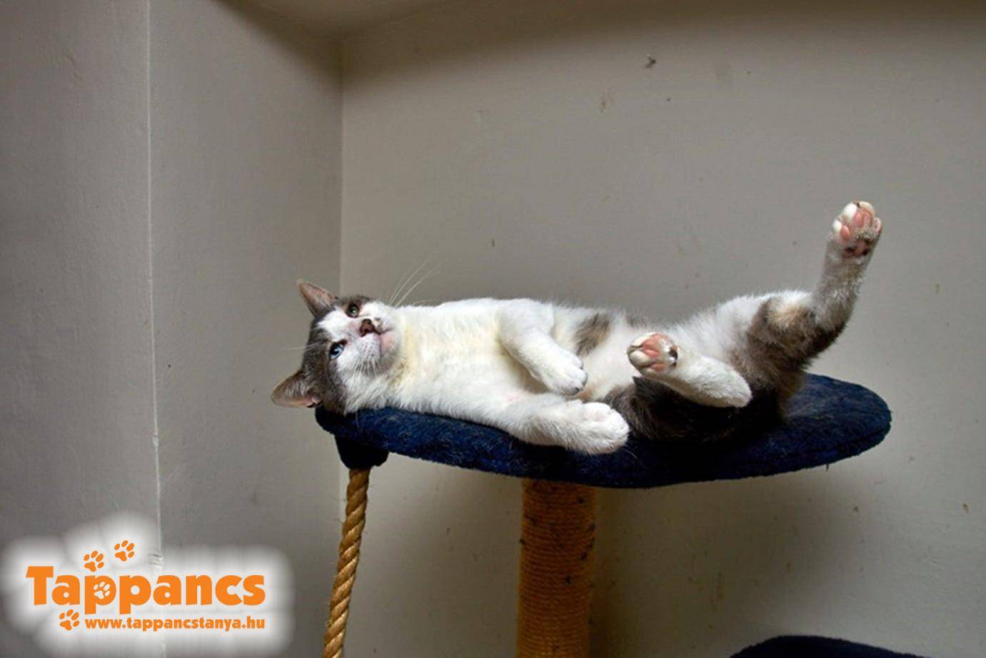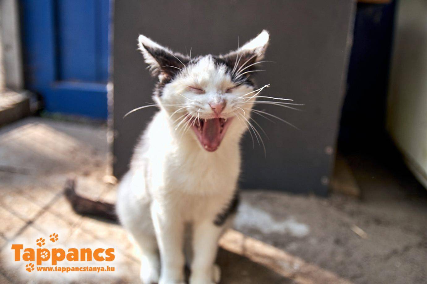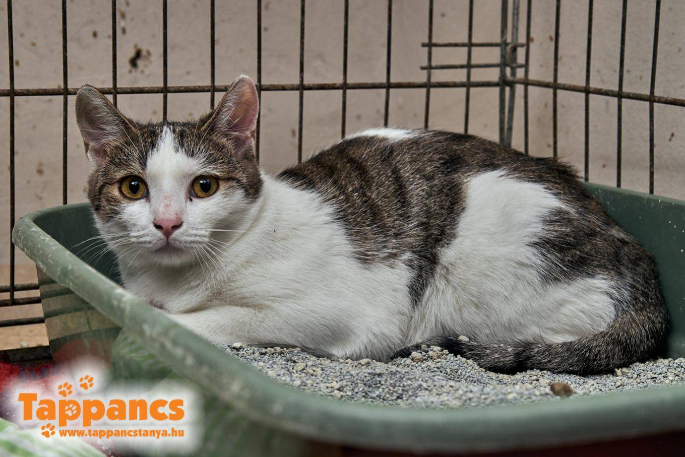 Kedden ismételten egy fekete jövevény "tarkította" az állományt. Ő a Dömper nevet kapta, nem véletlenül. A kölyök kandúrkát egy dorozsmai családi ház udvarába tessékelték be, és az volt a nagy szerencséje, hogy az ott lakók még idejében fel tudták nyalábolni a rá vadászó kutyák elől. Egy fás kamrában tudták elszállásolni az aprócska cicát, akit addig elláttak, míg nem tudtuk fogadni. Dömper ahogy cseperedett, egyre kíváncsibb lett a nagyvilágra, és leselkedett kifelé, de a kutyusok továbbra sem nézték jó szemmel a jelenlétét, így egyre kockázatosabbá vált a maradása. Most egy ketrecben tombolhat, szinte egy perc maradása sincs, ha épp nem a játékait nyüstöli, akkor fennhangon kiabál a kajáért, és mint egy kiéhezett dúvad, úgy vetődik rá az ételre. Emellett cuki és dorombolós gombóc.