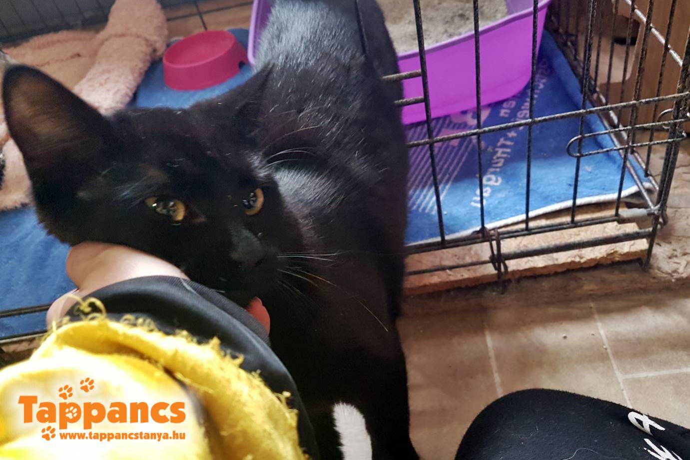 Kedden várólistáról megérkezett Domingó. Őt egy fiatal pár találta még korábban, egy erdőből szaladtak oda az elsétáló párhoz. A tesókat biztonságban elszállásolták, majd úgy tűnt gazdisodnak mindketten, de csak a szürke tesó járt sikerrel, Domingónak maradnia kellett és türelmesen várakozott, hogy bekerülhessen. Mondjuk a türelem nem az erélye, ezt már első pillanatban is leszűrtük, hisz a bezártság nem ínyére való, az, hogy nem ő van a középpontban, szintén derogál és ezt hangos, folyamatos nyávogással meg is erősíti. A nevét itt kapta, olyan kis urias ezzel a gyönyörű, ragyogó fekete bundijával. Igaz, azóta már új nevet aggattunk rá, a kis Vámpi lett a művészneve, mert mindig úgy szugerál, hogy két szemfogát kint felejti. Ő egy fél év körüli, nagyobb növésű kandúrka, aki nagy dumás és lételeme a figyelem és az emberi közelség.