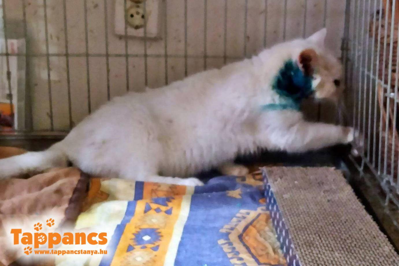 Szükségünk is volt Dimitri érkezésére, mert nem sokkal rá megérkezett állatorvosunk is egy cicával. A cicát egy dobozba lezárva a rendelője ajtajában hagyták. Amikor kibontotta, megcsapta orrát a rohadás szaga és látta, hogy a cica nyakán egy majd 10 centis, elfertőződött, kezeletlen lyuk van. A füle tövétől egész az álla alatt hiányzik a bőre. Ellátta, lekezelte. Füle tele volt atkával, és ahogy azt elkezdte kitakarítani, ömlött belőle a vére. Ijesztő volt, meg kell hagyni. Egyelőre nem is néztük meg a nemét, gondolhatják mennyire nem volt együttműködő ilyen állapotban. Annak is örültünk, hogy legalább enni tud. A Péntek névvel ruháztuk fel, igazából bármelyik nemhez passzol. Péntek sebét cukorterápiával kezeljük a fertőtlenítő, sebtisztítás után. Első napokban kétemberes művelet volt, majd Péntek rájött, hogy tőlünk nem kell tartani, és mert önmaga lenni, egy bújós, dorombolós cicalány. Sebe szinte napról napra kisebb, és szépen húzódik össze, ám elég furin tájolódik és reagál dolgokra, nem kizárt az sem, hogy vak a szentem. Vagy csak a gyulladás befolyásolja a tájékozódásban, ha van ilyen egyáltalán. Feltevések mindig vannak, de majd nyilván állatorvos erősíti meg az észrevételeinket.