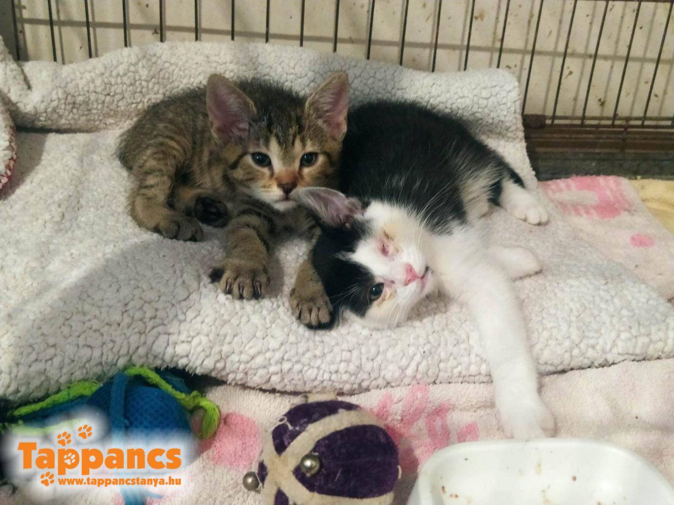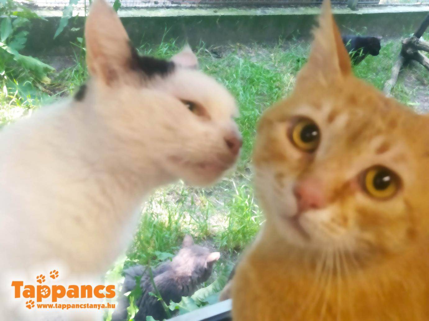 A tésztaház melletti bokor aljában cicák laktak. Már egyre kilátástalanabb volt a helyzetük, mert valakik folyamatosan eltüntették az etető, itató tálkáikat az utóbbi időben. Ahogy sorra kerültek a várólistán, az őket etető hölgy segített a cicákat begyűjteni az esti etetéskor, majd otthonában elszállásolta őket, míg másnap reggel kollégánk elgurult értük, hogy kihozza a menhelyre. A kandúrok másfél-két évesek, csodaszépek és imádják egymást. Ez már az első pillanatban is nyilvánvalóvá vált. Bigyó, a fekete bundás szépség a bátrabb kettejük közül, és egész testével védte félősebb öccsét, Bogyit. Bigyó hamar elkezdett nyitni felénk, jött begyűjteni a simiket, és dorombolva üdvözölt a ketrecük ajtajában. Bogyi sokkal zárkózottabb és bizonytalanabb volt, ő összerezzent minden érintéstől, az ő bizalmát el kell nyernünk.