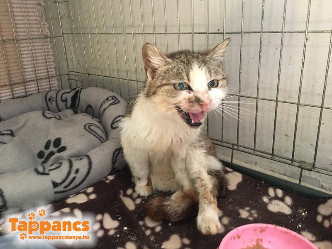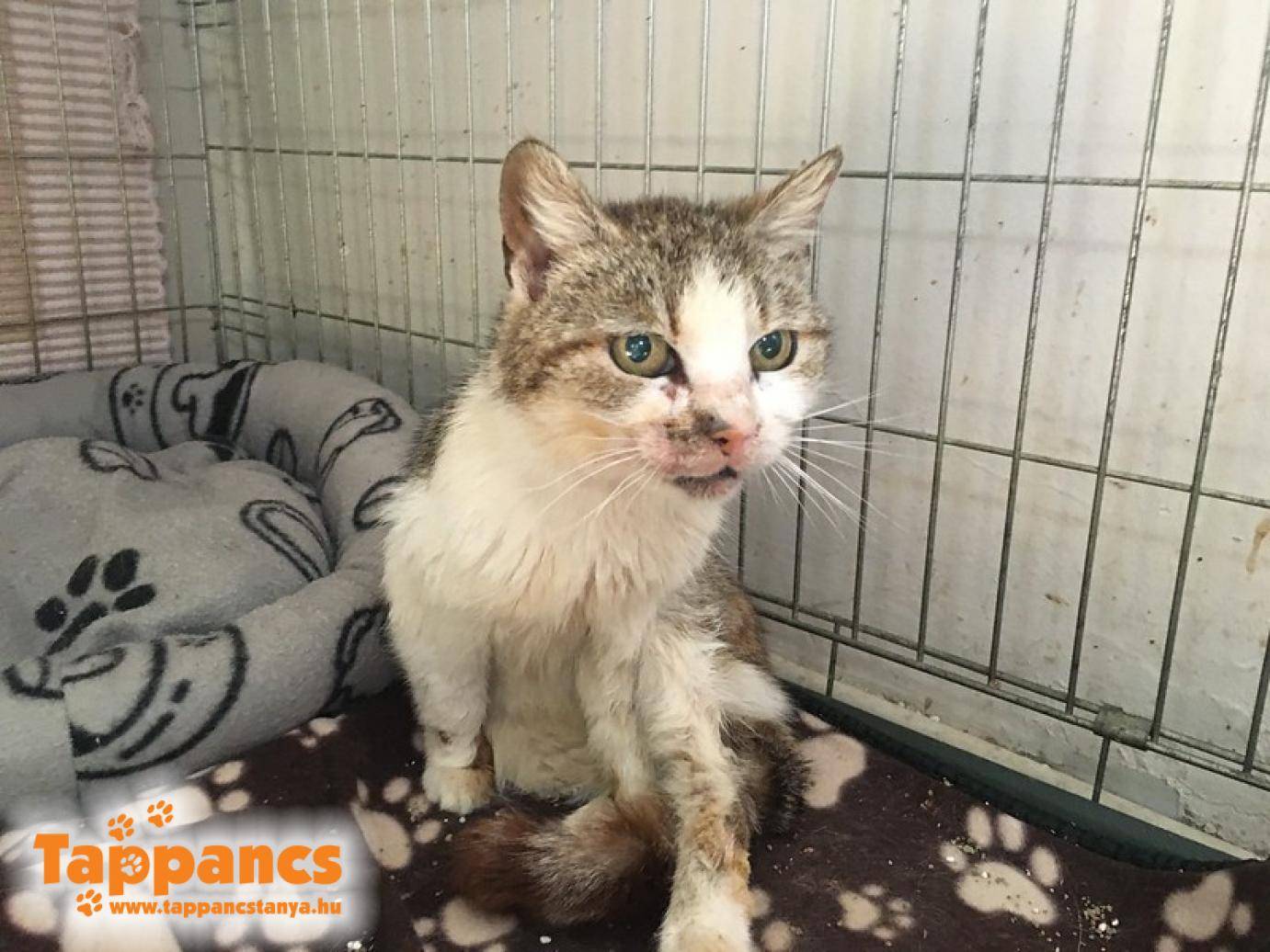 Egy út szélén fekvő cicát jelentettek, aki nagyon rossz állapotban van. Felkarolták és behozták. A bőre is beteg, hátán nagy foltokban hiányzik a szőre, sebes. A nyaka teljesen kopasz, ott is hatalmas sebek éktelenkednek. Náthás, váladékozik a szeme, orra, folyik a nyála, alig kap levegőt, emellé csont és bőr, erőtlen. Nem a napokban kezdett leépülni, az már biztos. A szokásos protokollt elkezdtük, mindenféle erősítőket, vitaminokat kapott a gyógypempőbe, valamint gyógyszereket a náthájára. Bőrét kék lukács krémmel kencéztük. Az idős cicalány a Xéna nevet kapta, amit a harcos amazon inspirált.