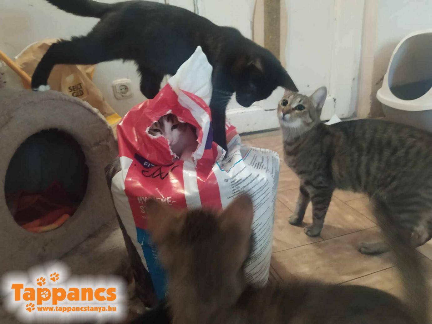 Ám nem mindig jók ezek a kölykök sem, de ez nem is elvárás. Nagyokat szoktunk nevetni a csínyeken és huncutságokon, amivel próbálnak minket vagy egymást megviccelni. Bütyök Aladár a csínyek nagymestere, ő külön agyal azon, hogy mivel rukkoljon elő minden nap. Rafináltan megpróbál kijutni a szobájukból, ám nem mindig észrevehető módon. Történt ugyanis, hogy takarításkor bent volt a szobában az almoszsák, mivel mindig újra kell tölteni a ládákat. Gondolt egyet, és óvatosan belebújt a kis résen, szó nélkül, mozdulatlanul. Mivel a végén jártunk a takarításnak, már épp pakoltuk volna ki a dolgokat, mikor láttuk, hogy az aprónép körberajongja a zsákot. Nyúlkálnak be, paskolják, nézegetik jobbról-balról, egyszer csak egy kis mancs kipaskolt a zsák résén. Akkor döbbentünk rá, hogy Bütyike bent van, és a friss alom tetején kuksolva, abban fetrengve megy a dorbézolás. Szó nélkül kivittük volna a szobájukból világot látni. De mindig tanítanak minket, így erre is jobban oda fogunk figyelni ezentúl. Imádnivaló, zseniális elme!