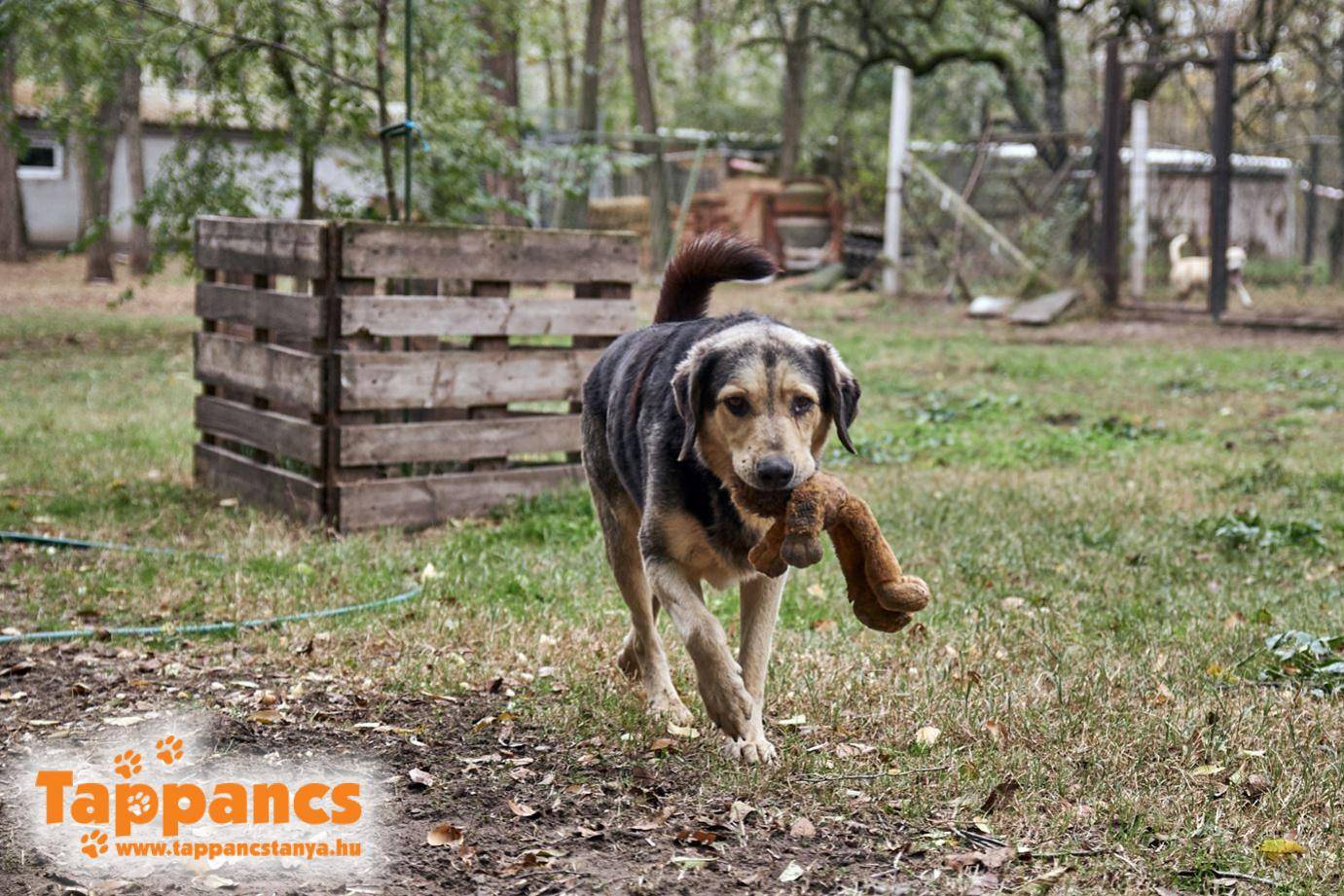 A raktárkonténerben pakolászás közepette egy nagy adag játékot szétosztottunk a lakóink között. Ha van kutya, aki imádja az újdonságokat, az Mogyoró, az illegális menhelyről kiszabadított kutyánk, aki már lassan két éve a lakónk. Eddig egy plüssoroszlánt cipelt mindenhová magával, és ha véletlenül nem tudta hol van, akkor a keresésére indult, majd boldogan dobta a levegőbe, amikor megtalálta. A plüssoroszlán igazán nagy becsben volt tartva, és habár nem szeretünk olyan játékokat adni a kutyáknak, mint a plüss, amit lenyelhetnek, vele azért tettünk kivételt, mert egyszer ellopta, és nagyon vigyázott rá. Az állandó cipelést azonban megsínylette, így most Mogyoró, és persze a többiek választhattak új játékot maguknak.