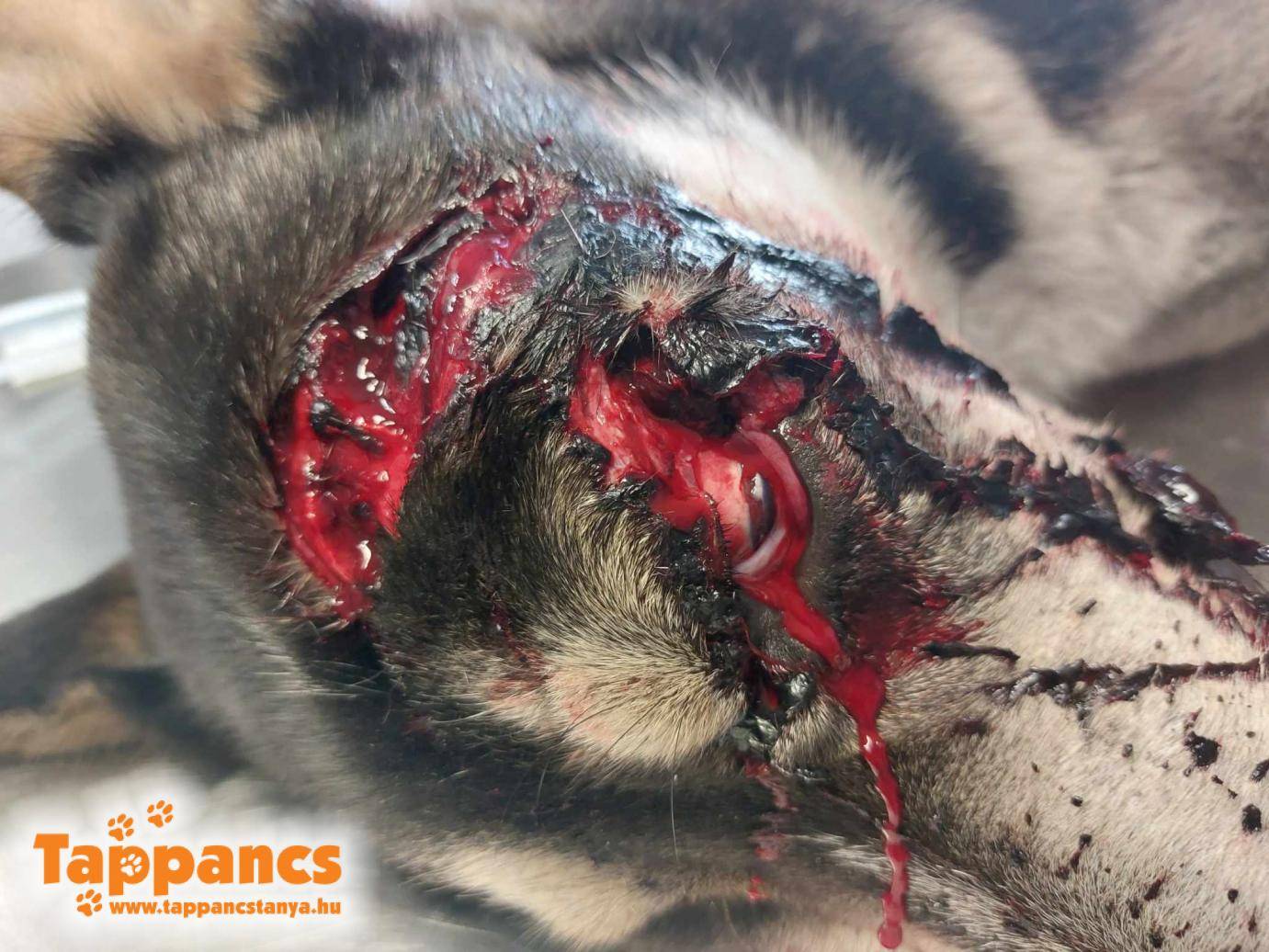 Mindenkinek az volt az első gondolata, hogy a kutyát valaki súlyosan bántalmazhatta valami éles tárggyal. Csak akkor, amikor sikerült bejutnunk az ügyeletes állatorvoshoz, akkor derült ki, hogy a kutya nem bántalmazás, hanem autóbaleset áldozata lett. Mivel jó magyar szokás szerint nem volt chipes, így az alapítványunk fizette a sürgősségi ellátás költségét. A kutya élete nem sokon múlott, az állapota fokozatosan romlott a vérveszteség miatt, tehát itt bizony minden perc számított. A pórul járt husky valahol mégis nagyon szerencsés, mert ugyan valószínűleg egyik szeme maradandó károsodást szenvedett, az élete megmaradt. Az arca sem lesz már olyan, mit a baleset előtt, ugyanis rengeteg bőrt el kellett távolítani, hogy össze lehessen varrni a sérüléseket.