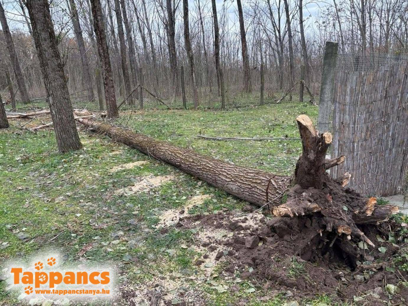 A nap méltó befejezéseként egy idős menhelyi nyárfának is letört a csúcsa, amit a többi fa tart jelenleg,hogy ne essen le. De nem úsztuk meg ennyivel! Egy másik nyárfa tövestől kidőlt, rá az egyik udvarunk kerítésére, ami természetesen meg is sérült. Úgyhogy késő délután még szakembert is kellett keresni, aki segít a megrongálódott fákat rendbe tenni, és a kerítésre dőlt fát összevágni. Szerencse a szerencsétlenségben, hogy ebben az udvarban nincsenek kutyák.