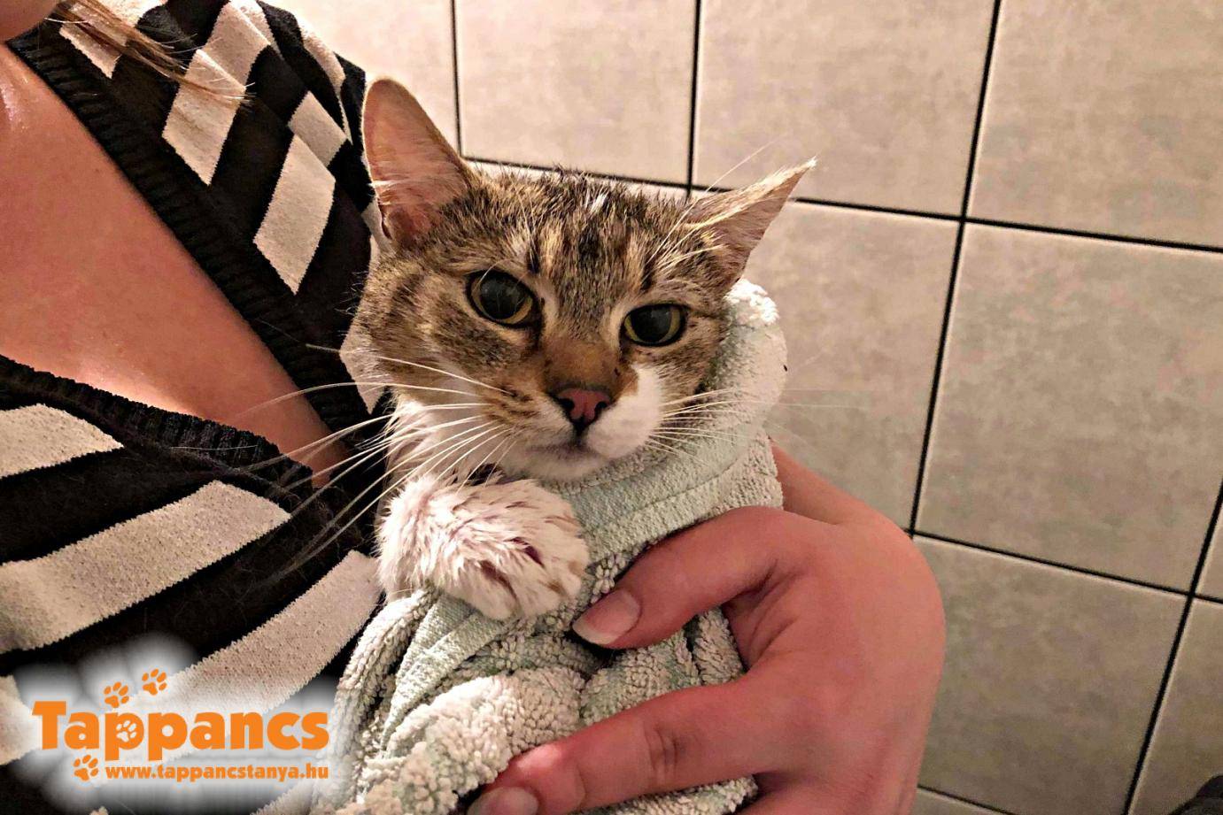 Bőven este 11 óra volt már, mire sikerült a cicát elhelyezni. Kapott egy steril kötést, illetve ráhúztunk egy rögtönzött kisruhát harisnyaszárból, hogy ne tudja piszkálni a cica a varratokat. Értelemszerűen így nem vihettük vissza oda, ahonnan jött. Naponta kétszer kapta az antibiotikumot, fecskendővel itattuk és immunerősítőzzük, mert az étvágya és a folyadékfogyasztása nem volt sokáig kielégítő. A gyógyszert szépen bevette, két nap alatt a félős, remegő cicából egy rendkívül hálás, bújós, dorombolós cica lett.