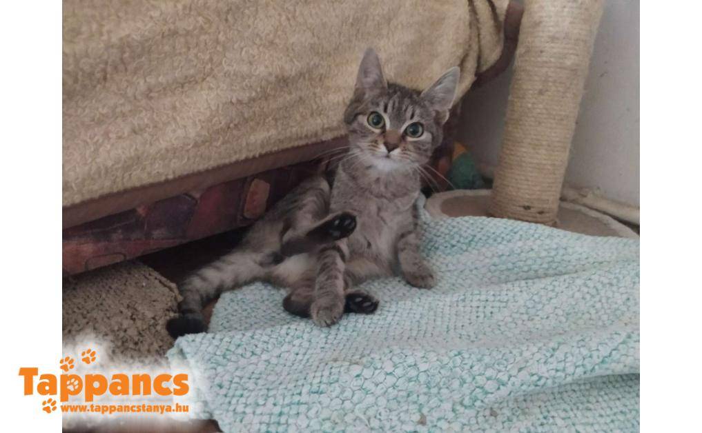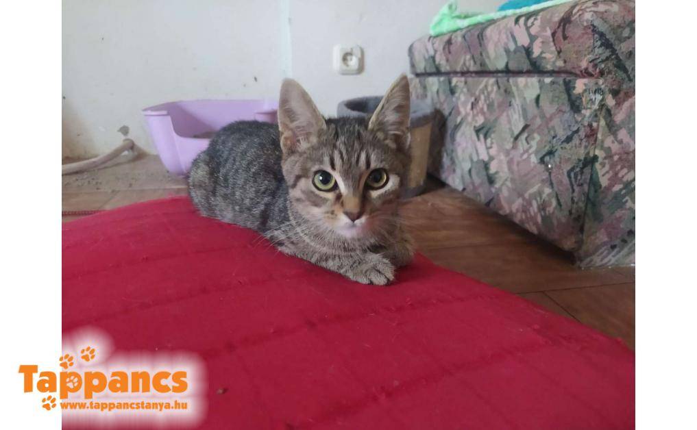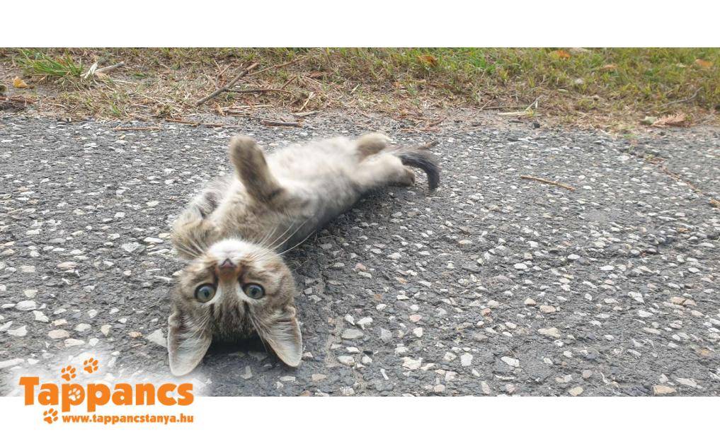 Kutyasétáltató önkénteseink az első körüket rótták, szerencsére a nyugodtabb természetű, idős kutyákkal, mikor a semmiből odacsapódott hozzájuk egy kis cirmos. Mindenáron szeretett volna velük tartani, a kutyák jelenléte sem váltott ki félelmet benne, csak tartozni akart valakihez. Hogy honnan csöppent oda, nem tudni. Pici, vézna és mindent bevetett ahhoz, hogy felhívja magára a figyelmet. A lányok tudták, hogy később keményebb kötésű kutyák is érkeznek, kik lehet nem nézik jó szemmel, ha lábuk között ficánkol egy apró cica, sőt a betonútra kirohangálva sem annyira biztonságos nekik, így egyik kezükben pórázzal, másik kézben cicával, visszasétáltak a menhelyre. Készítettünk elő számára egy mini ketrecet, jobb híján. Azonnal rábukott az eledelre, a pici adagját gyors be is falta. Aztán pedig csak dumált, dumált és dagasztott.... Dagasztott állva, ülve és az újjonnan szerzett párnáját is. Később még a száraztápot is, miközben falatozta. Ő Fülöp.