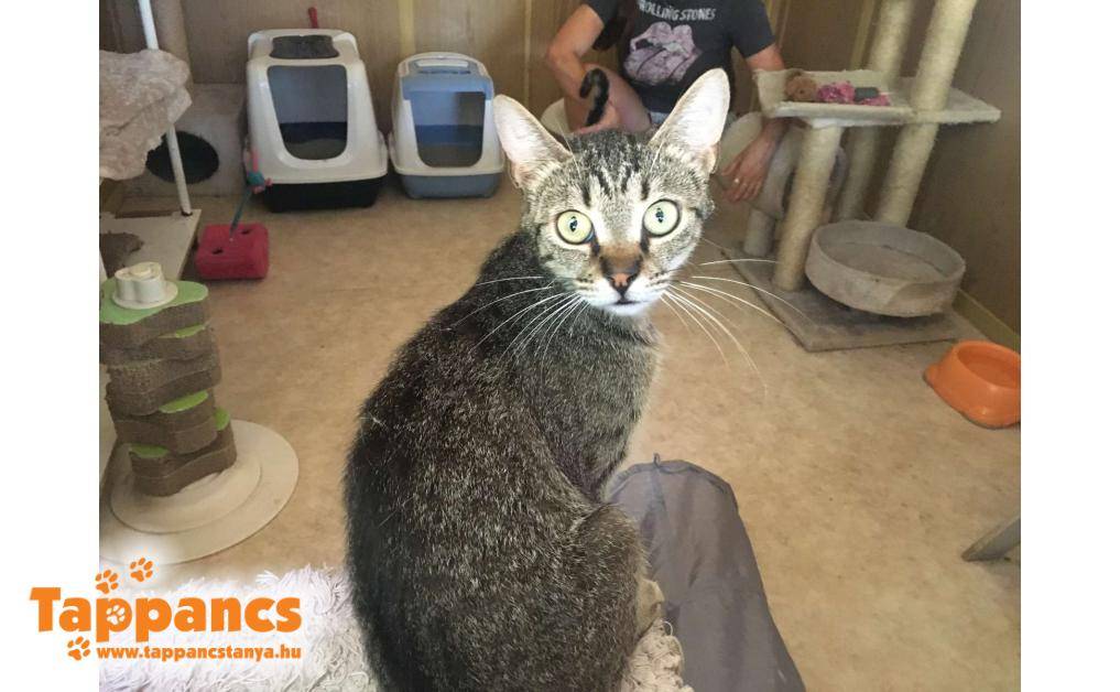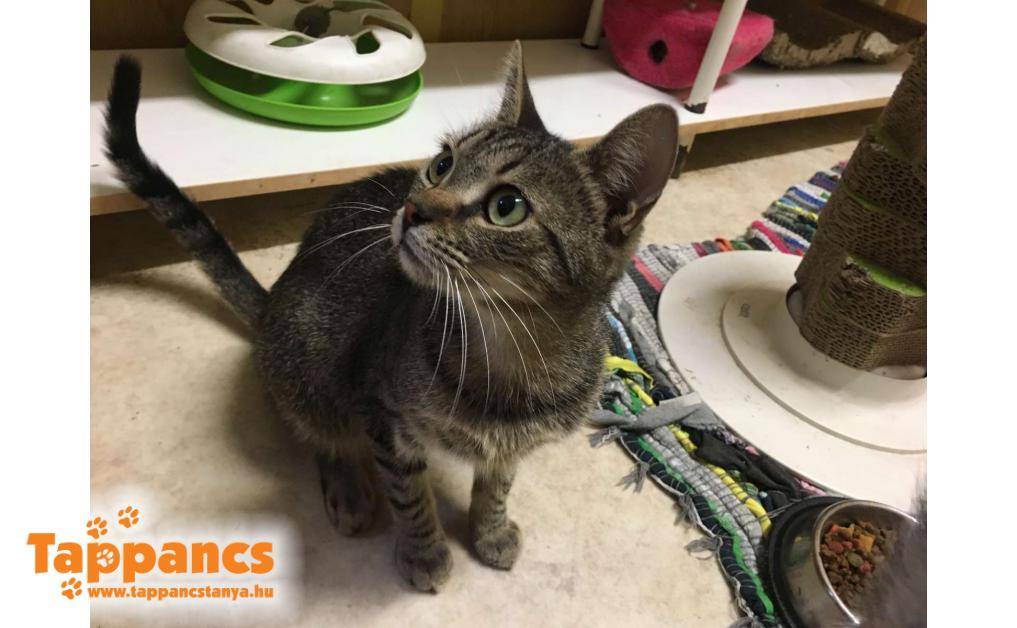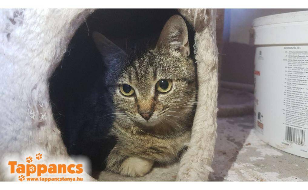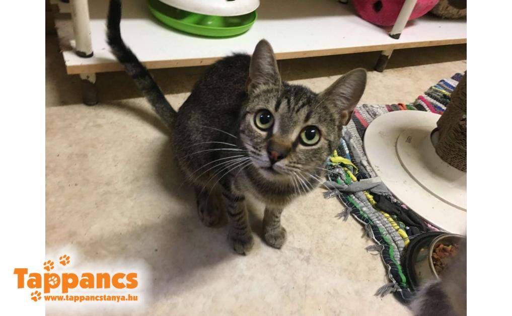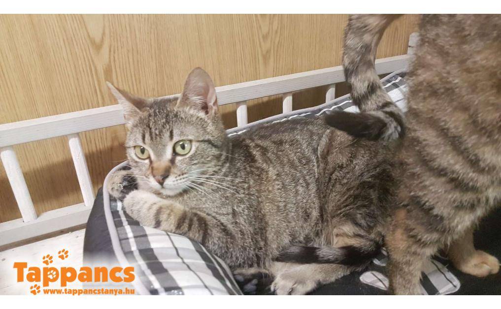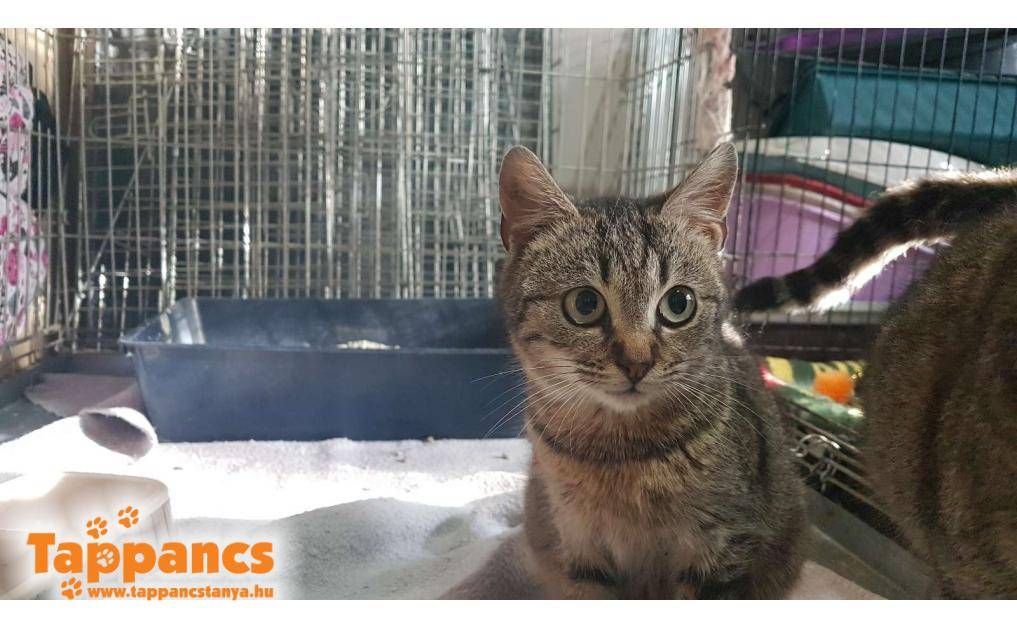 Az anya cica hónapok óta egy néni udvarában talált menedéket. Saját cicája mellett többen is odajárnak falatozni, de mindegyiküknek van gazdija. Ennek a fiatal cirmos leányzónak viszont úgy tűnt nincs, mert a napjai java részét ott töltötte, berendezkedett. Majd egy nap egy kis cirmos árnyéka is lett, aki folyton kísérgette mindenfelé és a nőstény cica nagy gondossággal tisztogatta, szeretgette. Minden bizonnyal a kölyke, amúgy sem tudná letagadni, hisz ugyanúgy néz ki mint az anyja. Várólistáról kerültek be, jelenleg 5 hónap körül van a kiskandúr, aki kicsit félős és továbbra is állandóan az anyja szoknyája alatt van. Anyja nagyon kedves, közvetlen cica, ő a Hidra nevet kapta, míg kölykét Humusznak neveztük el. Szerencsére a kiskrapek annyira nem volt megriadva, hogy ne essen neki az ételnek, holott a néni elmondása szerint bőven bereggelizett. Ennek nyoma sincs, és azóta is úgy fal a pici raptor, ha anyja nem elég ügyes, még az ő tálkájába is beledézsmál.