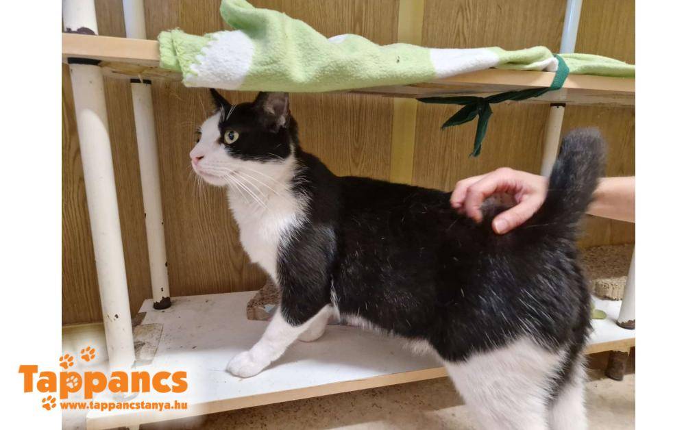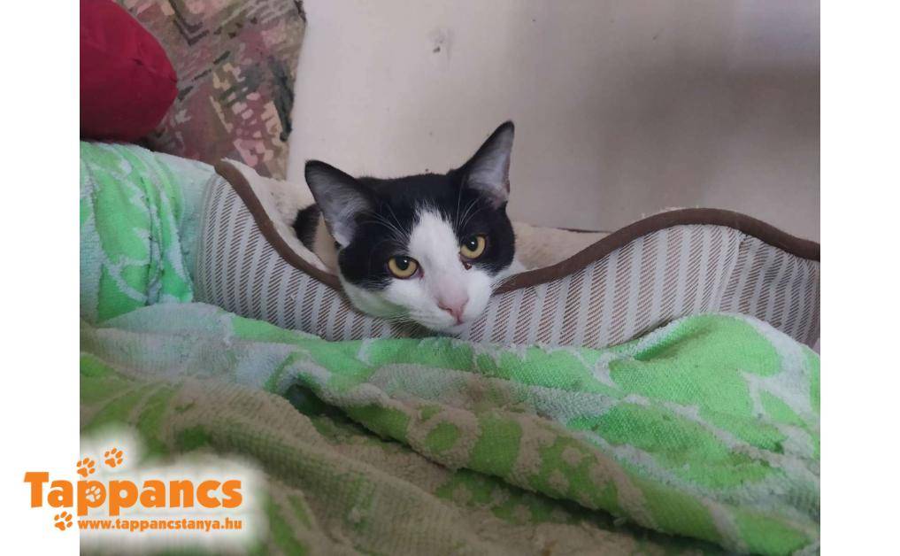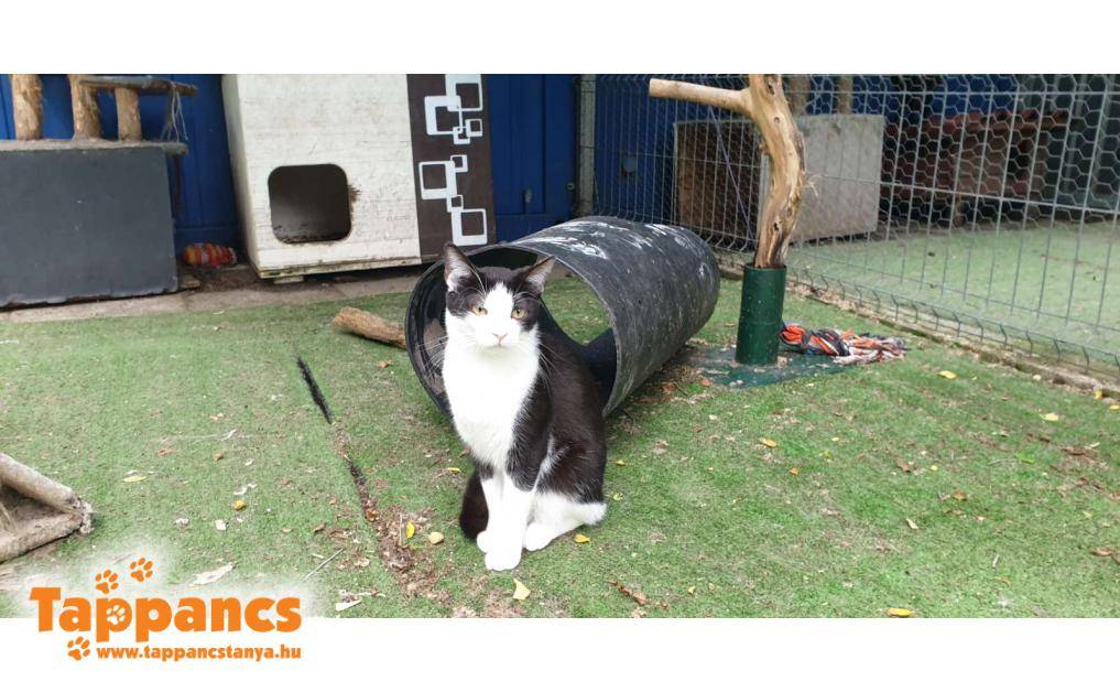 Felfedeztünk egy pirinykó fekete-fehér foltot az erdő szélén, nem messze a kutya kennelsor kifutótól. Ketrecbe kapott pici kaját, vizet, ez el is fogyott. Rendszerint ott várt minket a ketrec mellett etetési időben, gyorsan beletanult a dolgokba. De eléggé aggasztó volt, hogy bárhol befér, nehogy gond legyen. Szerencsére nem lett. Csütörtök reggel már ott csücsült a ketrec mellett, és annak rendje és módja szerint, pillanatok alatt eltűnt, mint a kámfor, mikor megindultunk arra. Felállítottuk a csapdát, és pici májkrémet kentünk a billenőre. Pehely súlyától tartva, nehogy ne érzékelje a rendszer, hogy le kell csapódnia, a májkrémet időigényesebb lenyalogatni. Bevált a taktika! Szinte pillanatok alatt meglett a kis gézengúz, aki nem más, mint a Májkrém nevet kapta. Körülbelül két hónapos fiúcska, fogalmunk sincs hogy került oda. Kicsit  koszos volt, és igencsak vékonyka, valamint nem is annyira boldog eleinte. De mikor rájött, hogy nem ártó szándékkal közeledünk, abba hagyta a fújást, és bár tartózkodott, azért a simogatás sem volt olyan rossz érzés számára.