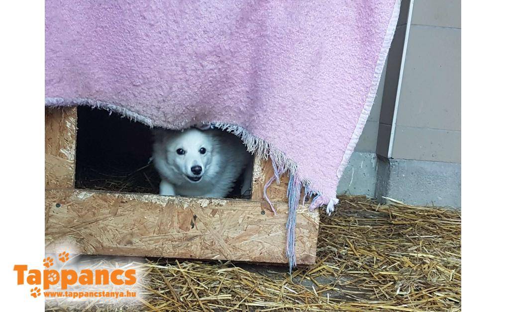 Pehelyt egyik reggel a menhely előtt lévő adománygyűjtő kosárba dobták ki. Mire a kolléganő kiért az irodából, már csak a kocsi nyomát látta, és a hátrahagyott kiskutyát. Chipje természetes nincs, szegény kutyus meg össze van zavarodva, egyenlőre kapkod.