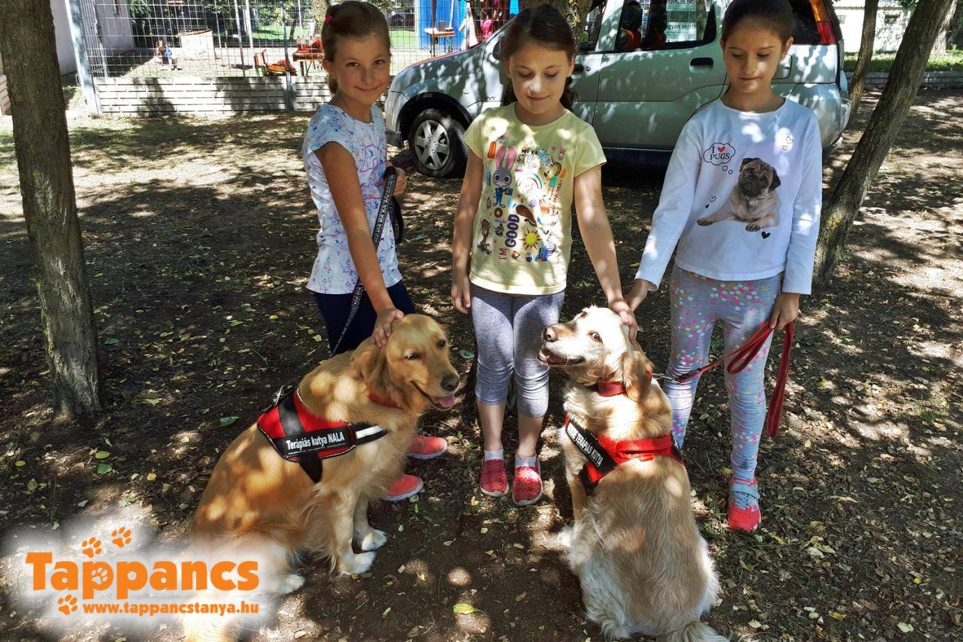 Két alkalommal terápiás kutyák is érkeztek. Rengeteg közös játék és trükk bemutató színesítette ezt a programot.