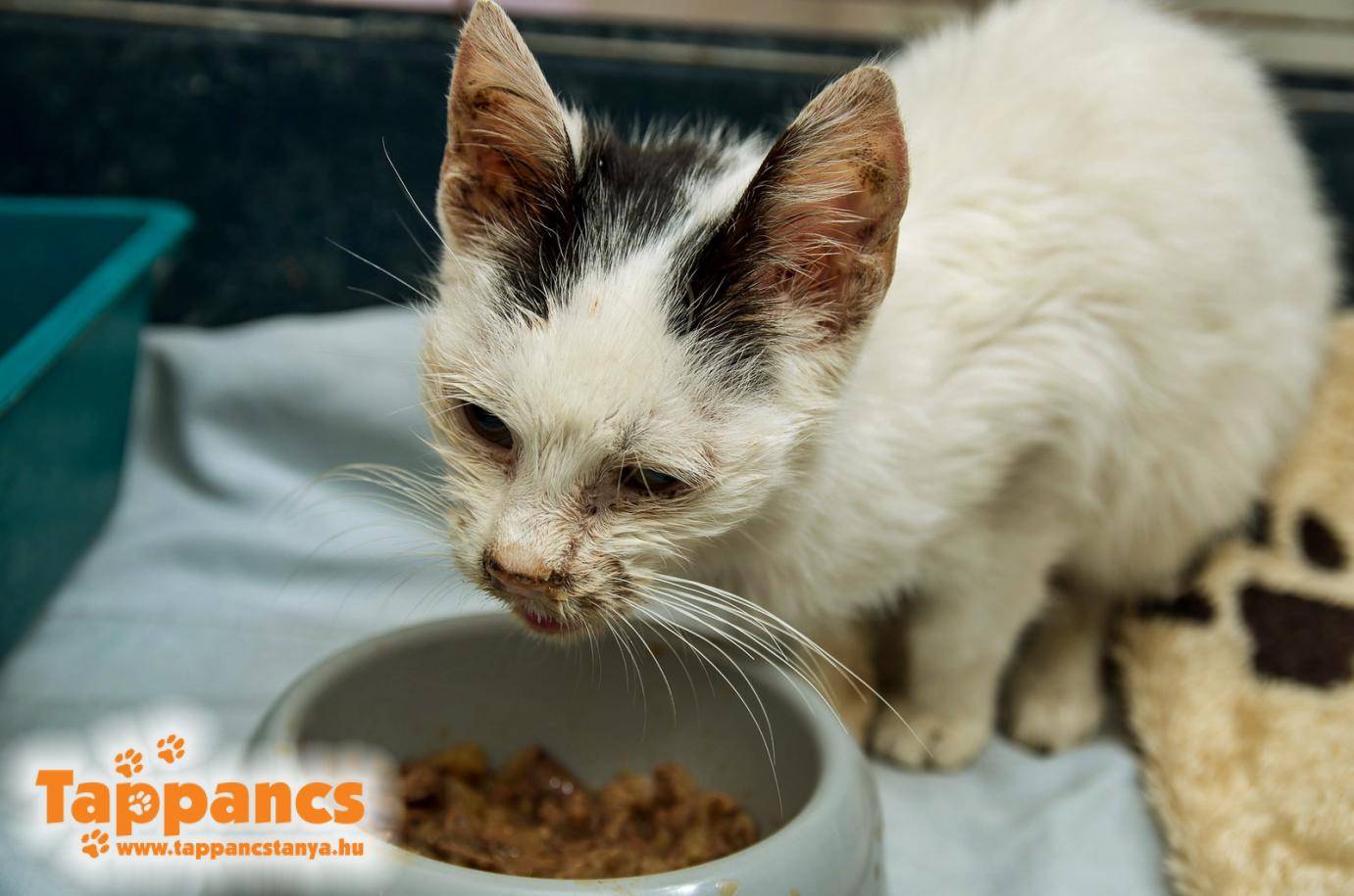 Csütörtökön újabb nem várt lakó költözött be. Ő Szüpürty, a fehér fekete foltos, barna farkú csenevész. Irgalmatlanul ramaty állapotban vettük át. Náthás, levegőt alig kap, orra bedugulva, száján lélegzik, szinte fuldoklik minden légvételnél. Szeme megtalálója ápolása ellenére is tiszta csipa, de legalább kilát egy kicsit, hemzseg a bolhától, csont és bőr, állni sincs ereje. Ilyen állapotban a karanténba nem mertem betenni, hisz lefertőzi az összes ott lakó cicát, ezért egy kis zugot alakítottunk ki neki a fürdőszobában, ahol lábadozhat nyugalomban. Hozzá érni is féltünk, de nem azért mert finnyásak vagyunk, hanem mert annyira törékeny a szentem. Elláttuk, kapott cseppet bolha ellen, másnapra szépen elkezdett kitisztulni, legalább ennyi gonddal kevesebb.
