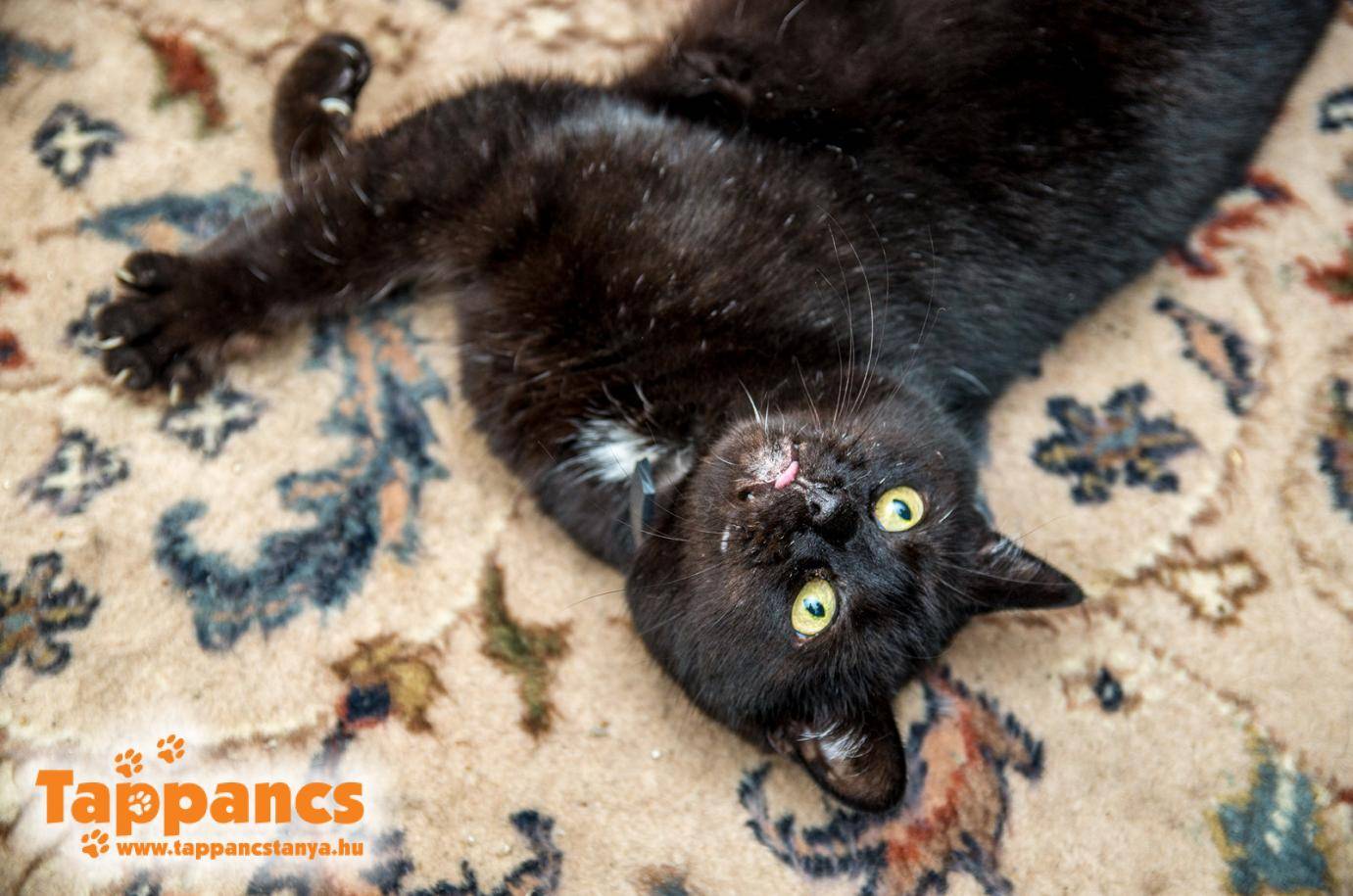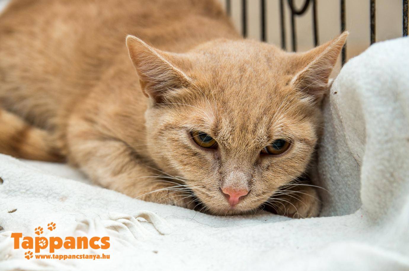 A következő hetünk sem indult zökkenőmentesen. Szentül hittük, hogy a meglepi, dobozos macskabegyűjtések idénre befejeződtek. Erre reggel, a vaksötétben a minket üdvözlő komondor körvonalait valami megtörte. Közelebb botorkálva láttuk, hogy ismét egy doboz... Feltüntetve, hogy egy felnőtt macska van benne. Felemelve tapasztaltuk, hogy egy lyuk van a doboz alján. Szerencsére az alján kezdett el kaparni a szerencsétlen, csak ezért nem tudott megszökni, pedig biztos ez volt a szándéka. A feje kifért volna a lyukon, és ha a feje kint van... Hisz tudja mindenki. Most tanulmányoztuk jobban körbe a dobozt, mert eddig nem értettük, miért van különböző kartondarab ráragasztva az egyik oldalára. Azért kérem alássan, mert egy szabályos ajtócska van vágva a dobozra, és amint sikerült becserkészni az áldozatot, egy másik darab kartonnal zárják le az ajtót. Úgyhogy nem a véletlen műve, hogy a cicákat valaki jó szándékkal begyűjti és kihozza, hanem erre készül, hogy gyanútlan bársonytalpúakat úgymond levadásszon... Nem értjük a lényegét, mi késztet bárkit is erre, vagy mikor lesz ennek vége? Ez a kétségbeesett vörös kandúr zavarodottan csöppent be a ketrecbe, a világáról sem tudott. Remegve, fejjel csapódott a rácsoknak, eleinte azt hittük vak. A Sárga nevet kapta és beletelt pár napba, míg elfogadta a helyzetét. Még nagyon bizalmatlan, de agressziónak semmi jelét sem mutatja és az érintést is lapos üzemmódban, de jól viseli.