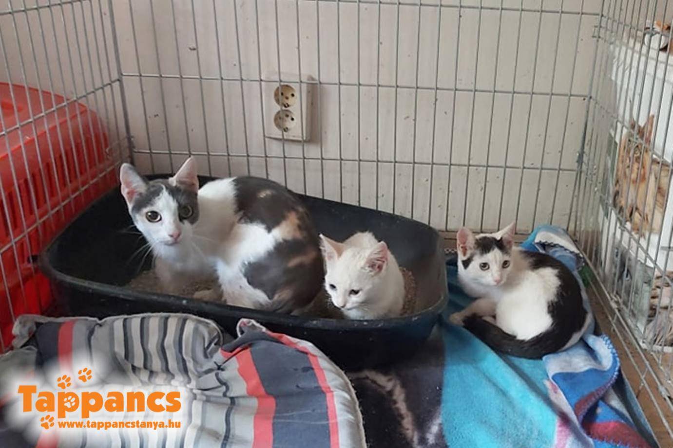 A másik fiatal nőstény a Trina nevet kapta, ő a két nagyobb kölyökkel lett elhelyezve egyelőre. A kis fehér lányka a Triniti, míg a legnagyobb kandúrka a Titó nevet kapták. Triniti egyelőre a legfélénkebb, de mentségére szóljon, hogy különleges heterokrómiás, azaz felemás szemszíne mellett nagy eséllyel siket. Nem reagál hangokra, a táp csörgésére sem, ha hátulról érintjük meg, megretten.