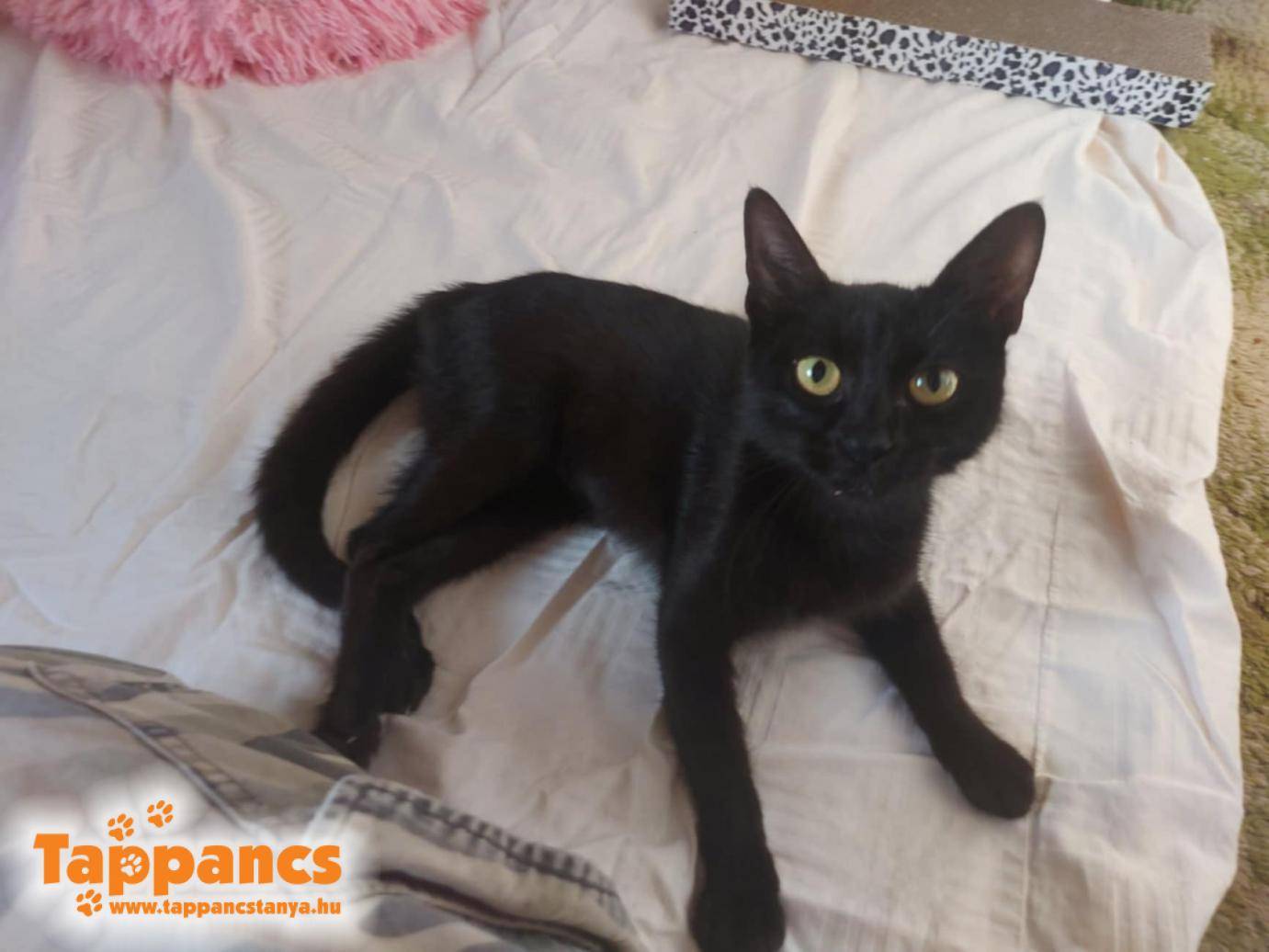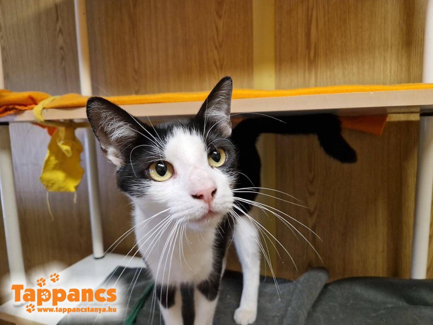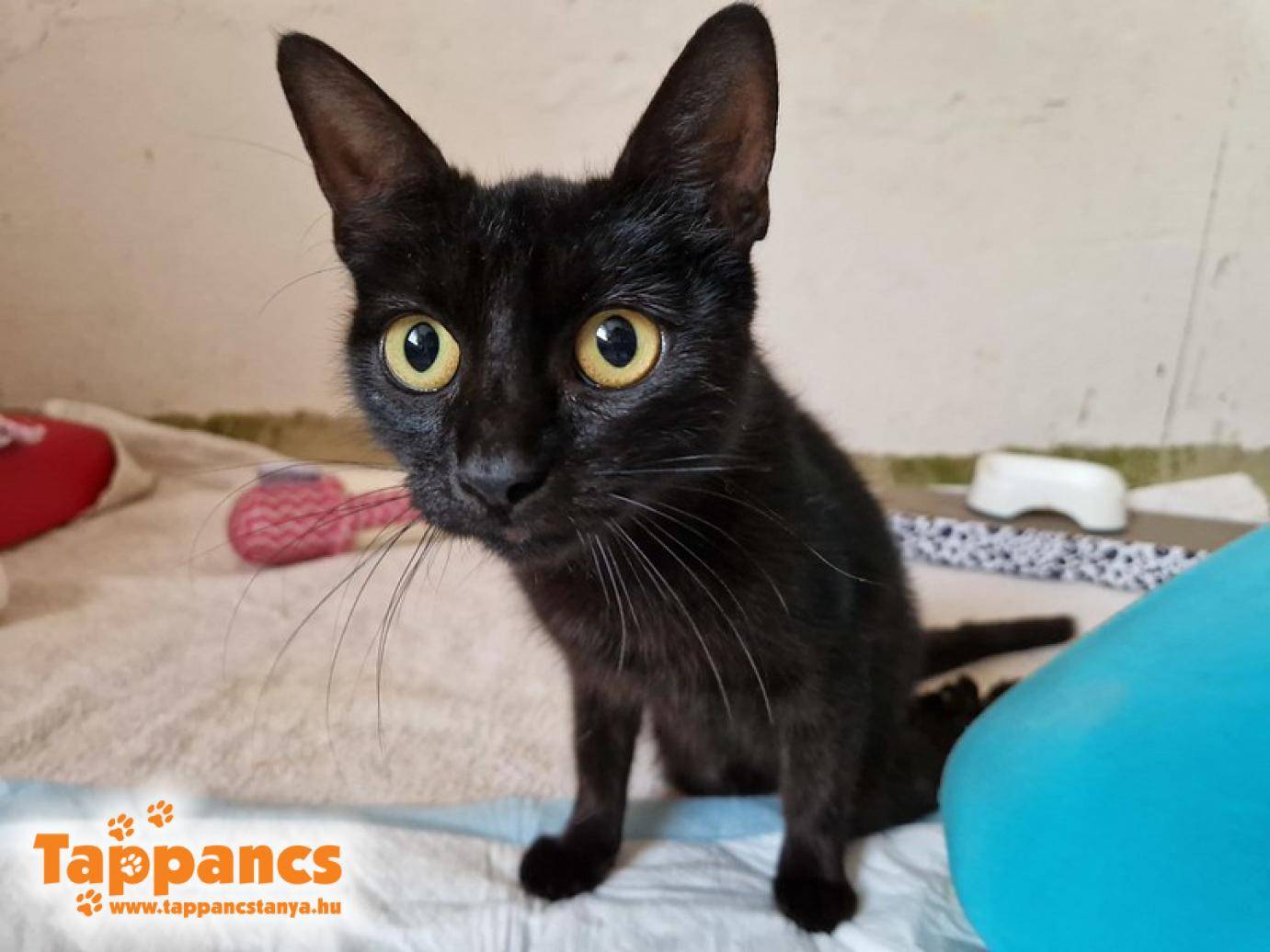 Kleopátra ivartalanítás utáni hege szépen begyógyult, így átköltöztettük a felkészítő szobába. Egyelőre nem értette, honnan ez a sok új arc mindenfelé, jobbnak látta a fotel mögül szemlélni a dolgokat. De aztán megtalálta az új kedvenc helyét.