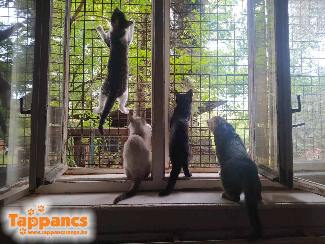 A kicsik a felkészítőszobában valami hihetetlen elevenek. Azt leszámítva, hogy állandóan pörgésben vannak, nem szűnt meg a ragaszkodásuk irányunkban sem. Amint betoppanunk, már csimpaszkodnak fel a nyakukba, és igazából bárhonnan érkezhetnek, a földről, a kaparótorony tetejéről, teljesen mindegy, valahonnan becsapódnak. Alomtakarításkor is a frizuránkat rendezi át valamelyikük, általában Adél a haj és fül felelős. De a többiek is gátlástalanul másznak, ugranak ránk. Ám nem csak ránk, igazából mindenhova, remek légtáncos társulattá alakultak. Bütyök Aladár is az ablak felső peremén egyensúlyoz, de a többiek is rendszerint nyújtóztatják magukat a rácson csüngve, függőlegesen. Arról nem is beszélve, hogy ha egy légy bemerészkedik a szobájukba, a plafonig felugranak egyszerre többen is. Pár nap alatt a fiatal felnőtteket is teljesen megbabonázták, és őket is ugyanúgy elkapja a hév, ha beindul a kis hatos fogat.