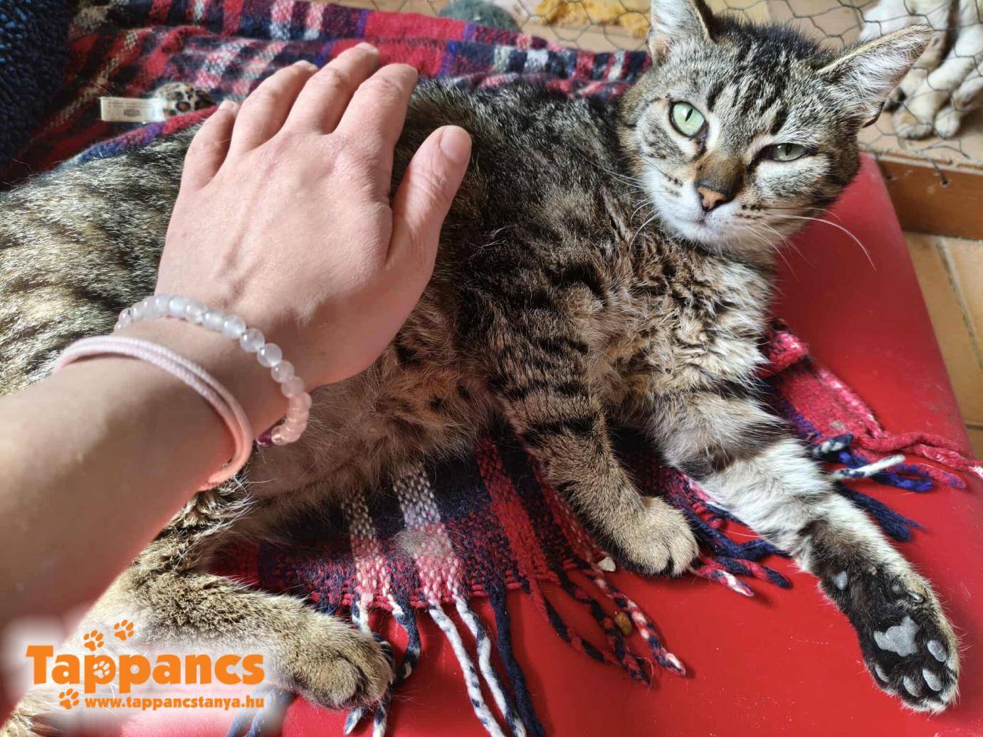 D.C. szeme alatt kis sebszerű képződmény alakult ki, amit lekentünk betadinnal, kék krémmel, hisz azt hittük valami sérülés. Ám vakarta és a kenegetés sem volt ínyére. Nyilván nekünk sem volt a kedvenc elfoglaltságunk, hisz közvetlen a szeme alatt volt, nagyon óvatosan kellett kencézni. D.C. pedig nem az a türelmes fajta cica, neki mindig dolga van, menni kell. A lényeg a lényeg, hogy elküldtük Dr. Tímár Endréhez őt is szemkörnyék vizsgálatra, ha már arra tartottak az állatok, hogy derüljön ki mi az, amit néha sikerül neki véresre kaparnia. A doktor úr megállapította, hogy gomba, kapott is egy injekciót rá. Teljes kétségbeesésünkben, hogy honnan szedte össze, mikor állandóan fertőtlenítőben úszunk, ha egyik szobából, helyiségből a másikba megyünk... Arra a döntésre jutottunk, hogy akkor felvisszük a felkészítő szobába, mert az örökbefogadó lakrészen vannak macerásabb cicák, akiket nem tudnánk gomba elleni krémmel kenegetni, ha netalántán jelentkezne rajtuk. Úgyhogy D.C. berobbant a felkészítő szobába. Ő nem az a nagyon bújós más cicákkal, meg ott éppen csak három cukker fiú van, kevesebb a kockázata, hogy elkapják. Valamint csírájában lett elcsípve, úgyhogy biztos gyorsan túl lesz rajta.