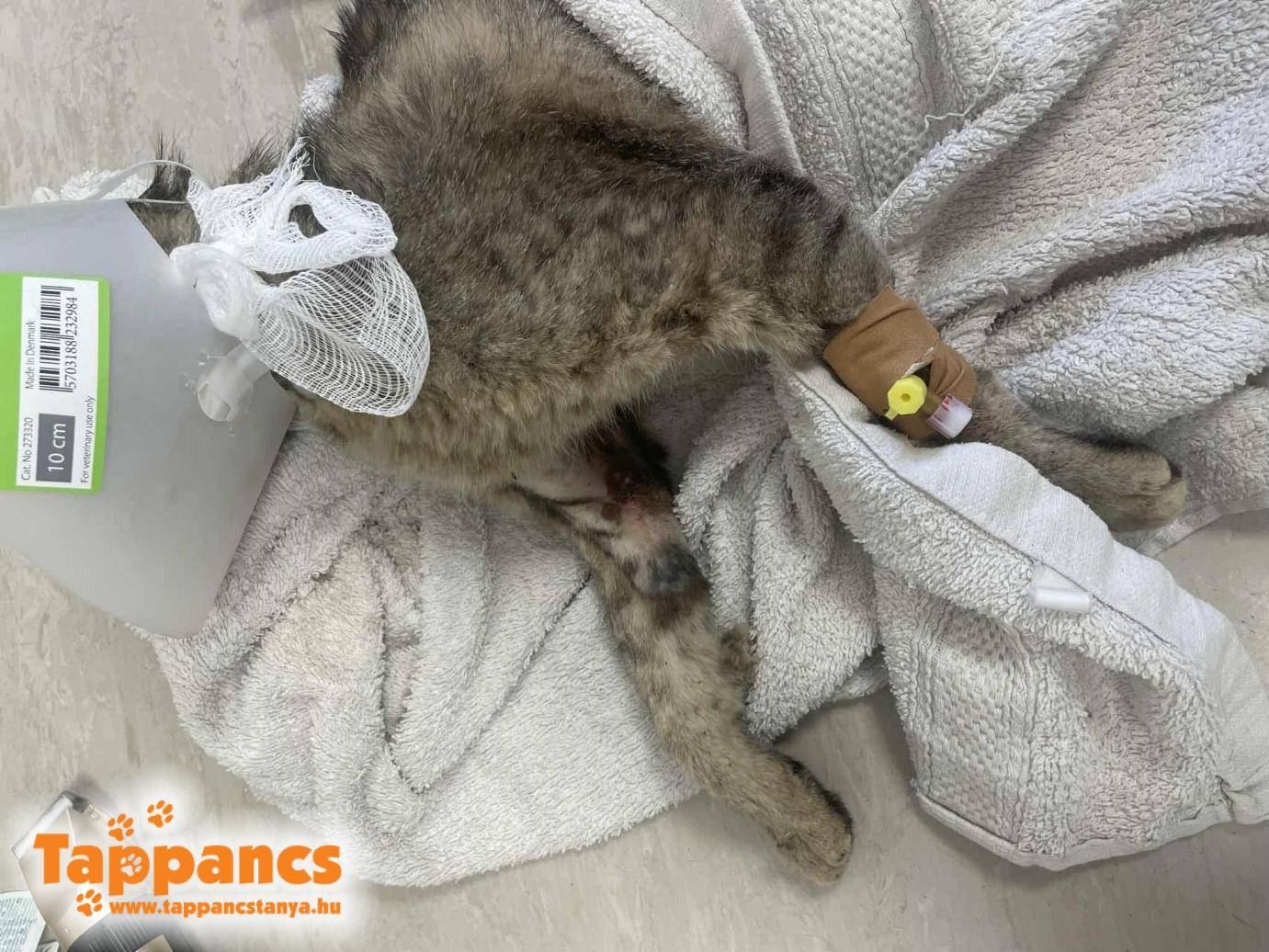 A frissen bekerült balesetes cica, Tapi már eszegetett. Igaz, fekve és segítséggel, de az biztató, hogy van étvágya. Viszont minden érintésre morgolódik, biztos nagy fájdalmai vannak, amire gyógyszert kap. Közben egy gyors vizitre is beugrott kollégánk vele a Vezér Állatorvosi rendelőbe, semmi változás sincs, de kapott még infúziót a nagyfiú.