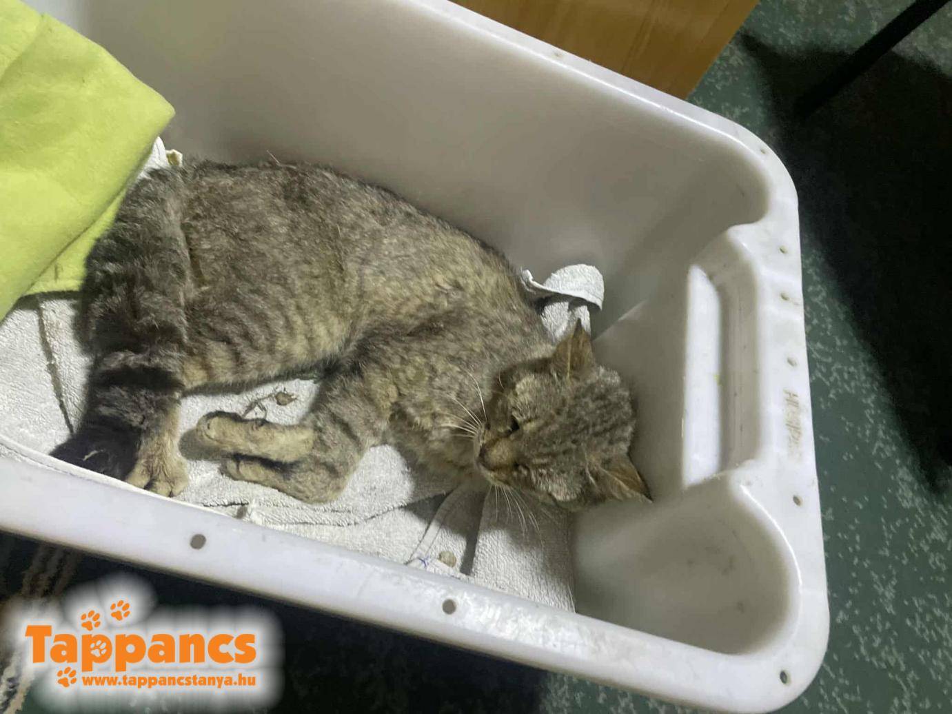 Hétvégén egy korábbi önkéntesünk kért segítséget, előző este az utcáról egy sérült cicát szedtek össze. Nem tudott mozogni, sem enni, inni. Kértük, vigyék be a Vezér Állatorvosi rendelőbe, és miután ellátták, hozzák ki. Nagyon hálásak vagyunk Líviának és szüleinek, hogy rászánták a napjukat ,és nem hagyták magára a cicát. A rendelőben vizsgálatok sora következett. Nem jók a kilátások sajnos, vélhetően elütötték. A végtagjaiban fájdalomérzet volt, ellenben felállni nem tudott. Orrából gennyes váladék folyt, nyakcsigolyánál csontos elváltozás látható. Jobb mellső lábán lévő sebből és a végbélnyílásából is lárvák ürültek. Kitakarították a sebeket, kapott injekciókat, fájdalomcsillapítót, gyulladáscsökkentőt, vitaminokat. Kétséges a gyógyulás esélye, de rajtunk nem múlik, lehető legjobb tudásunk szerint igyekszünk őt ellátni, etetni, itatni... Morgolódik érintéskor, de biztos valaha volt gazdája, mert nagyon szép nagy kandúr, aki alig pár éves még. Jövő hét elején kontroll vizsgálatra kell mennie. A cicát Tapinak keresztelték el.
