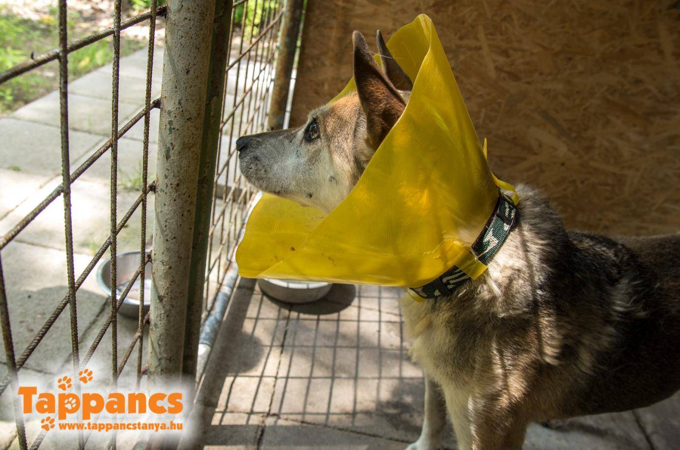 Egyelőre gallért kapott, és el kellett különíteni egy betonos kennelbe, ami az ízületeinek nem túl jó, viszont így kevesebb a valószínűsége, hogy szennyeződhet a sebe.