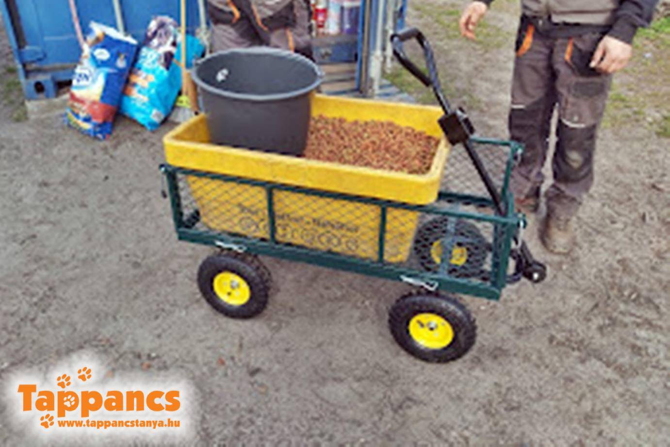 Munkaszolgálatba állt legújabb szerzeményünk, a gurulós kocsi, ami alaposan megkönnyíti az életünket. Ezzel a kiskocsival könnyebbé válik az etetés, illetve az adományok mobilizálása, főleg így hogy nagyobb hely van rajta, mint egy talicskán, és jobban is terhelhető.