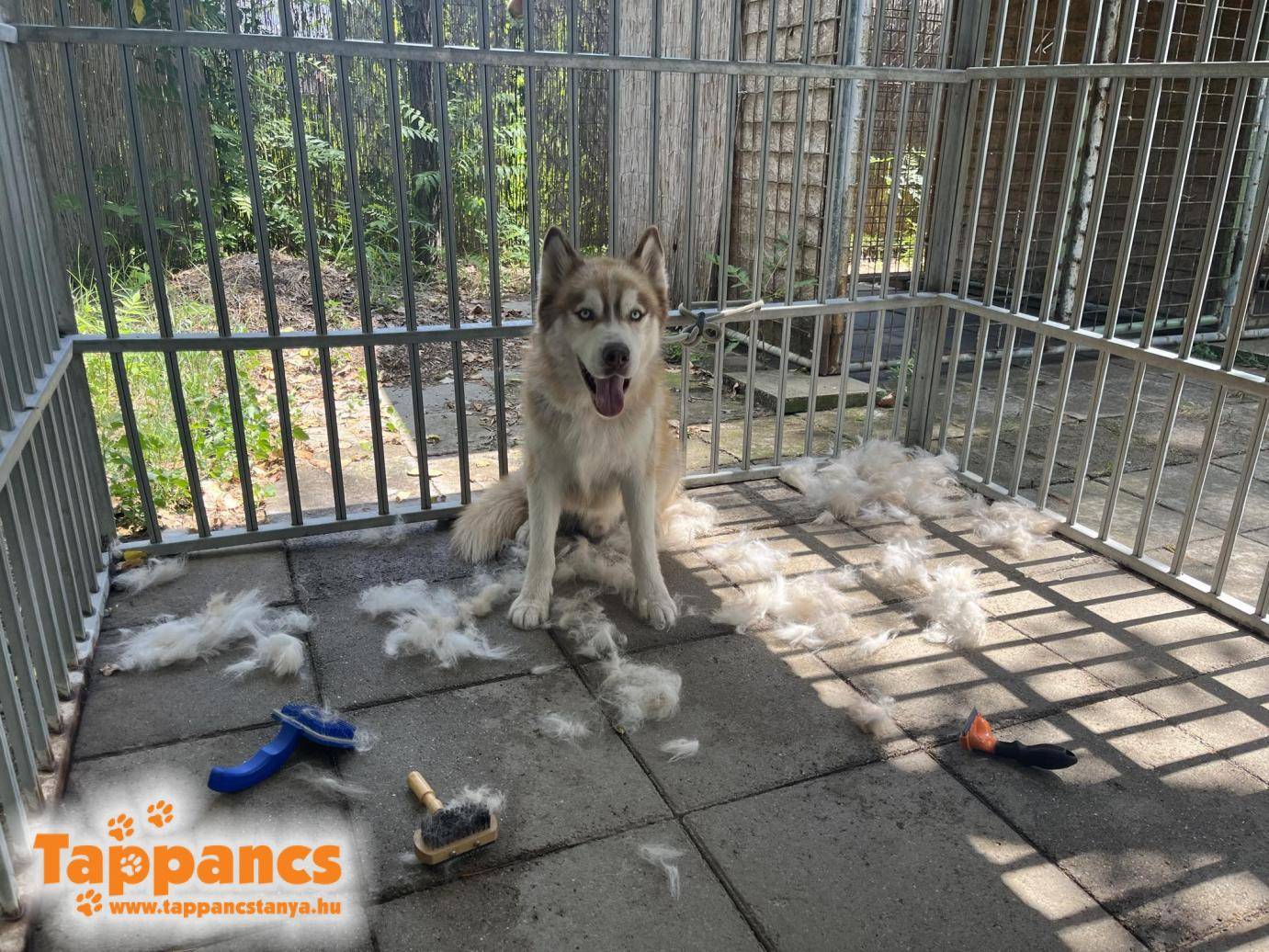 Merész pedig hozza a szokásos husky viselkedést. Keresi a szökési útvonalat, ráadásul most az új helytől, új helyzettől is eléggé meg van ijedve. Igen, már a második huskyt hozzuk át a gyepmesteri telepről, de még mindig nem azért, mert gyűjtjük a már meglévő tucat husky jellegű kutyánk mellé, hanem mert most neki(k) kellett a segítség. Nyilvánvalóan egy szökős kutyát még nekünk is igen nehéz feladat biztos körülmények közé örökbeadni,nemhogy egy gyepmesteri telepen. Úgyhogy Merész sokadik huskyként keresi nálunk felelsősségteljes gazdiját.