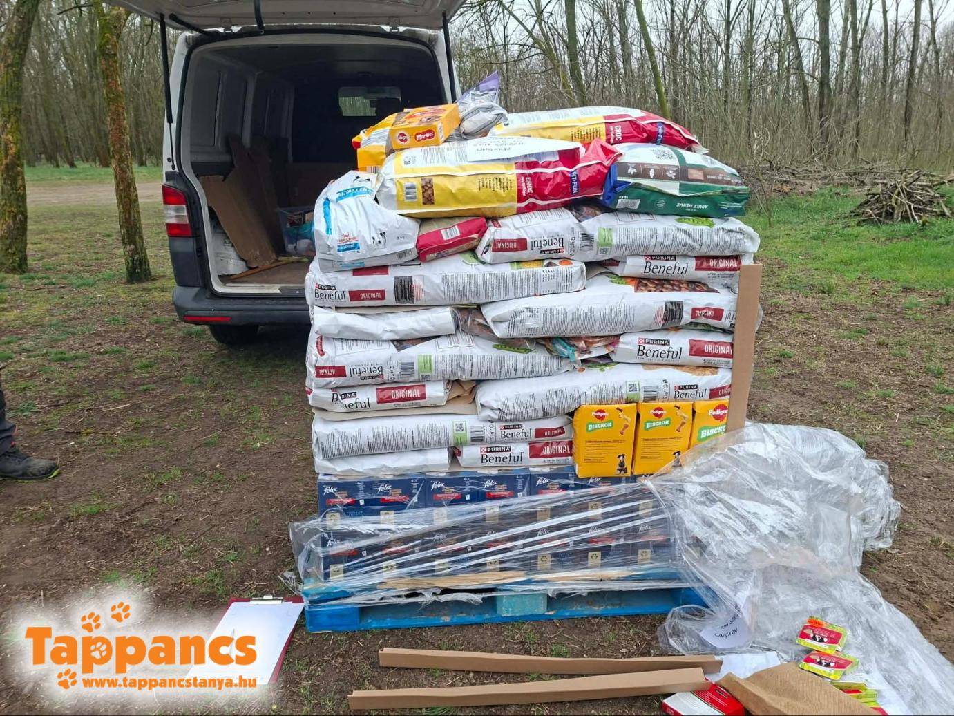 Délután, az állatorvosos nap után még akadt pakolnivaló is a menhelyen. Osztrák partner szervezetünk ugyanis meglepett minket három raklapnyi állateledellel, ami több felvonásba fog a menhelyre érkezni.