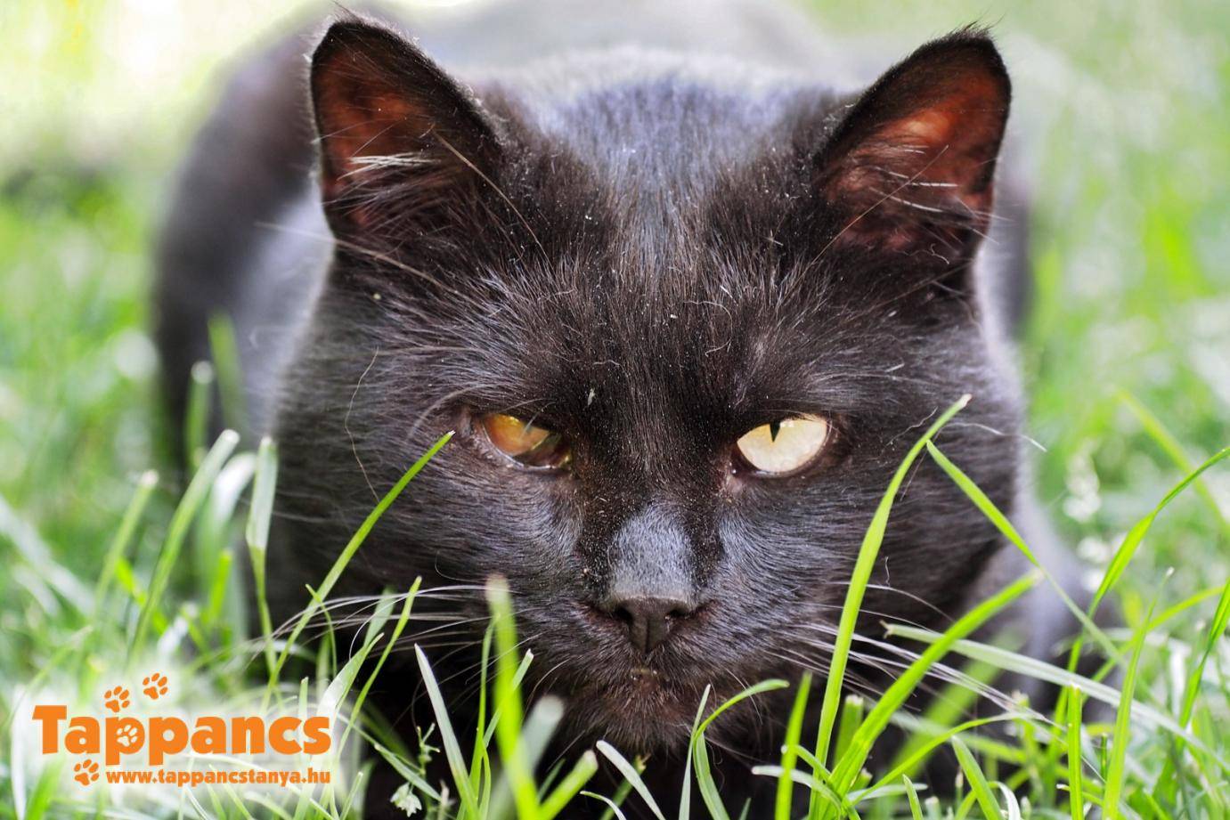Negró még januárban került a gondozásunkba Vikicával együtt a hírhedt szatymazi horrortanyáról. Borzalmas körülmények között éltek ők ketten, egy mocskos, soha ki nem takarított ketrecben ivarosan összezárva hónapokig, talán évekig, normális étel és tiszta ivóvíz nélkül. Sokáig küzdöttünk a betegségekkel, a kóros alultápláltsággal, de a folyamatos állatorvosi kontroll és a rengeteg gondoskodás meghozta az eredményt. Sajnos Negrónak már olyan szinten volt beteg a szeme, hogy az egyiken a hályog már örökre megmarad, ettől függetlenül lát a szemével, csak korlátozottabban. A másik szeme egészséges, sikeresen kikezeltük a macskanáthából és a kötőhártyagyulladásból. A fogazata is borzalmas állapotban volt, összesen két szemfoga maradt, amit műtétileg el kellett távolítani, mert fájt neki az evés és rövidesen mindenképp kihullottak volna. A fogeltávolítás óta már nincsenek fájdalmai, szépen eszi még a szárazat is, így fogatlanul is. Zord, igazi fekete párducos tekintete ellenére kedves, bújós cica, igényli az ember társaságát és nagyon szeretne már végre egy saját gazdit. 5-6 év körüli lehet (a fogazatának hiánya miatt nehezen meghatározható). Többszörösen parazitamentesített (Advocate cseppek és tablettás féreghajtók), ivartalanított, FIV/FeLV tesztje negatív. Kétszer oltott nagykombinált oltással, amely leukózis ellen is véd. Kizárólag benti tartásra fogadható örökbe, vagy olyan kertesházba, ahol 100000%-os védelmet nyújtó macskabiztos kerítés van, a házba szabad bejárással, örökbefogadási szerződéssel.